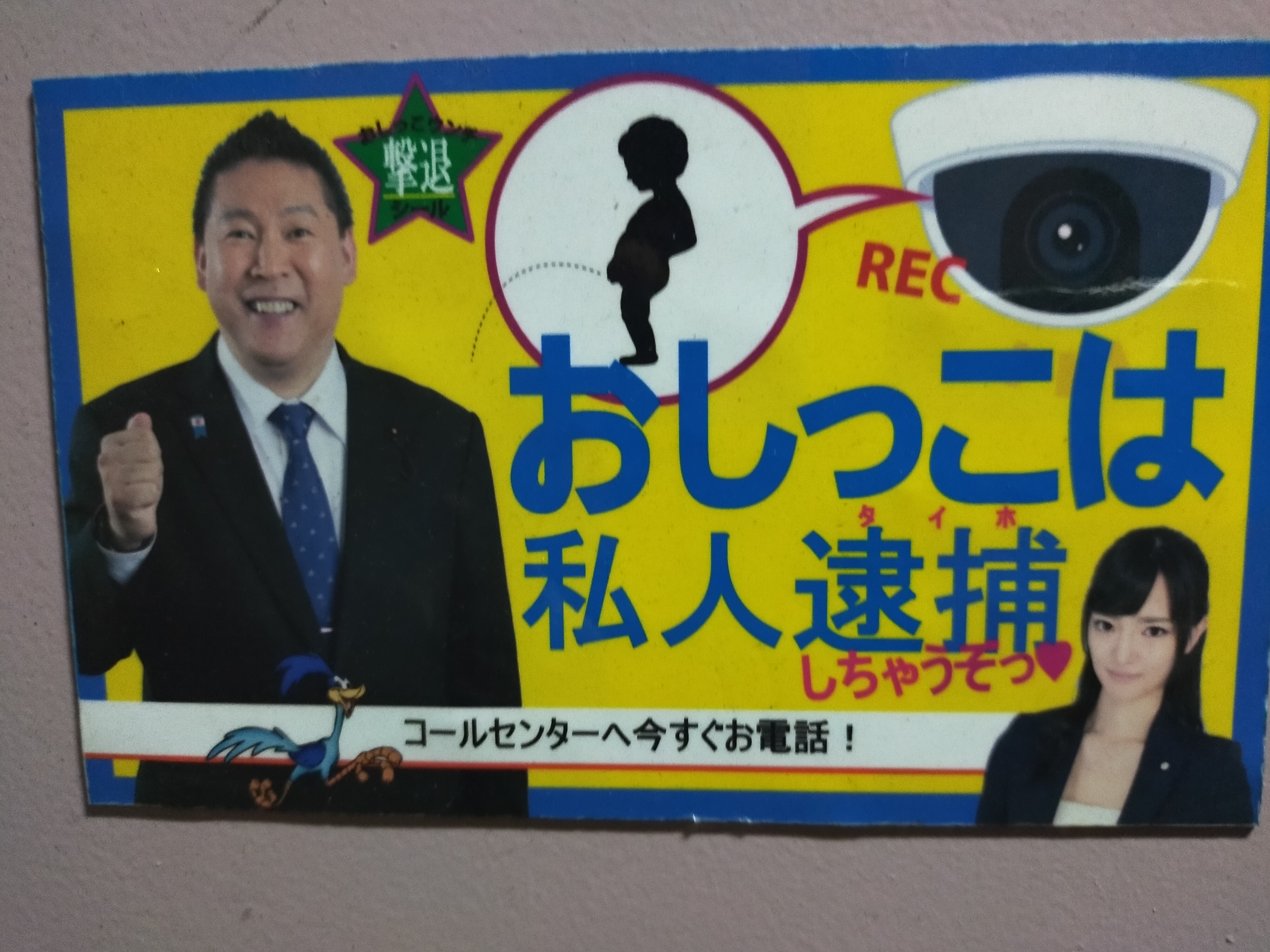 立ち小便を防止するためのステッカーだと思うが、冷静に考えるとそれは犬猫の所業なんだよな。