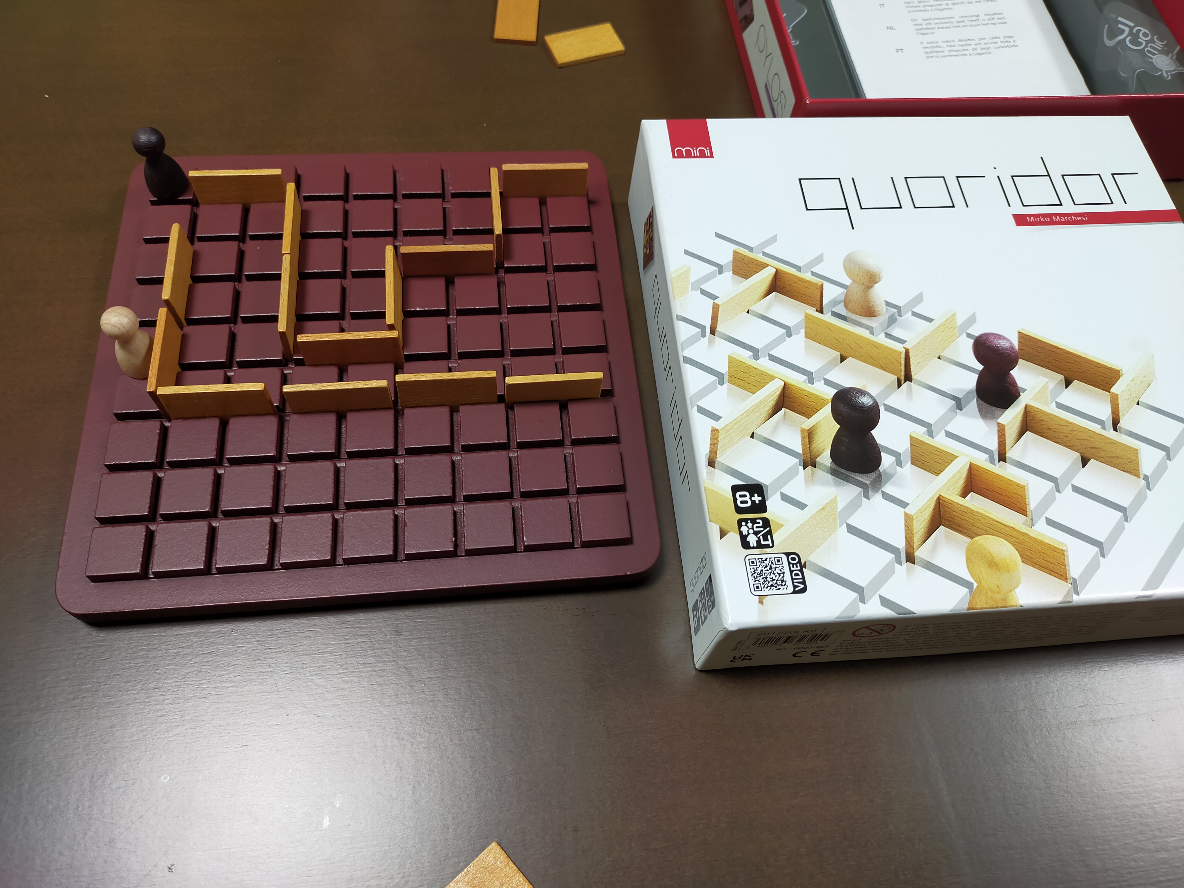 コリドーラという2-4人で遊べるボードゲームで、手持ちの板で妨害をしつつ、初期位置から対角線のライン上に到達したプレイヤーの勝ち。