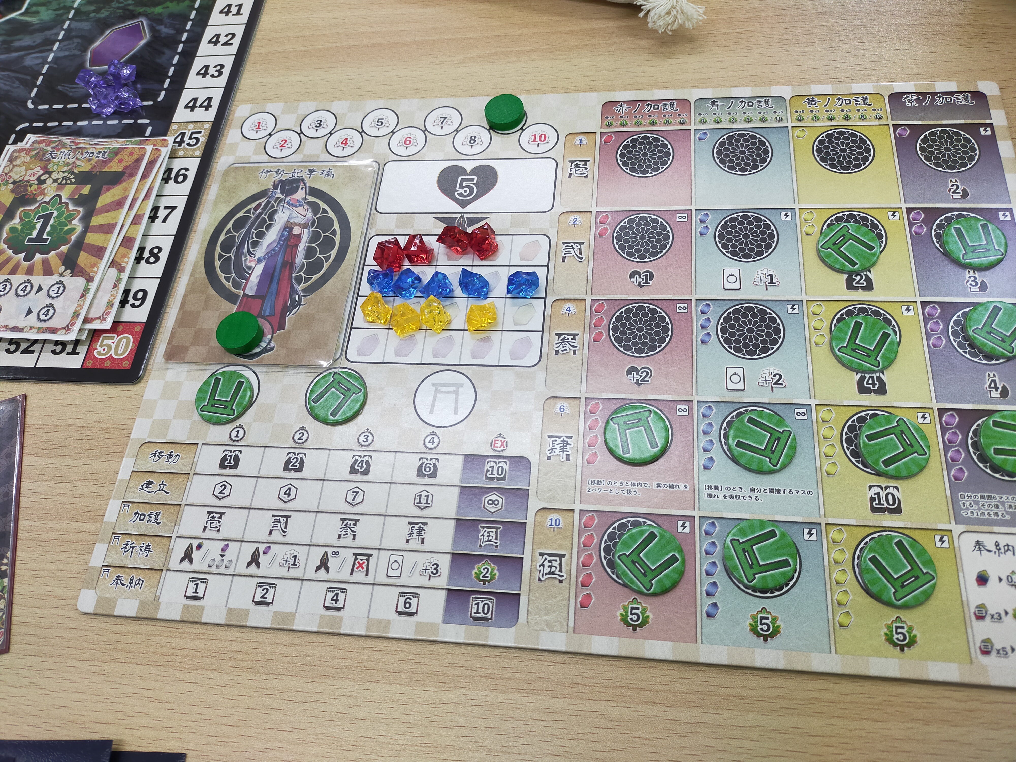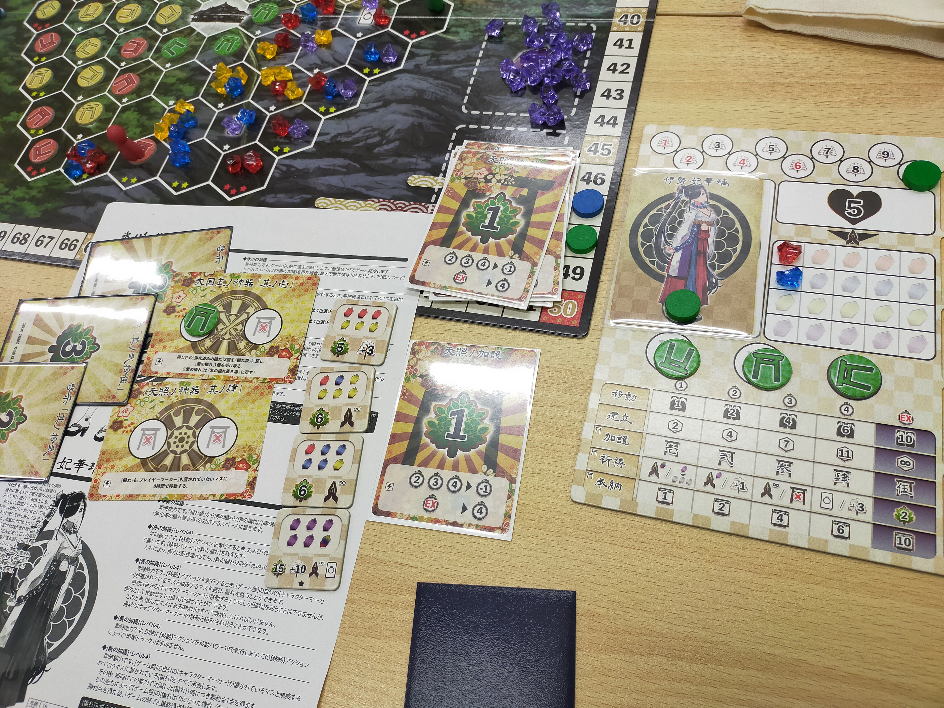 それぞれの巫女が穢れを払いながら(資源を回収しながら)、資源を変換したり、自分の社を建てたり、勝利点を手に入れたり、加護を開放したり(強くなったり)、色々しつつ勝利点の多い個人の勝利。