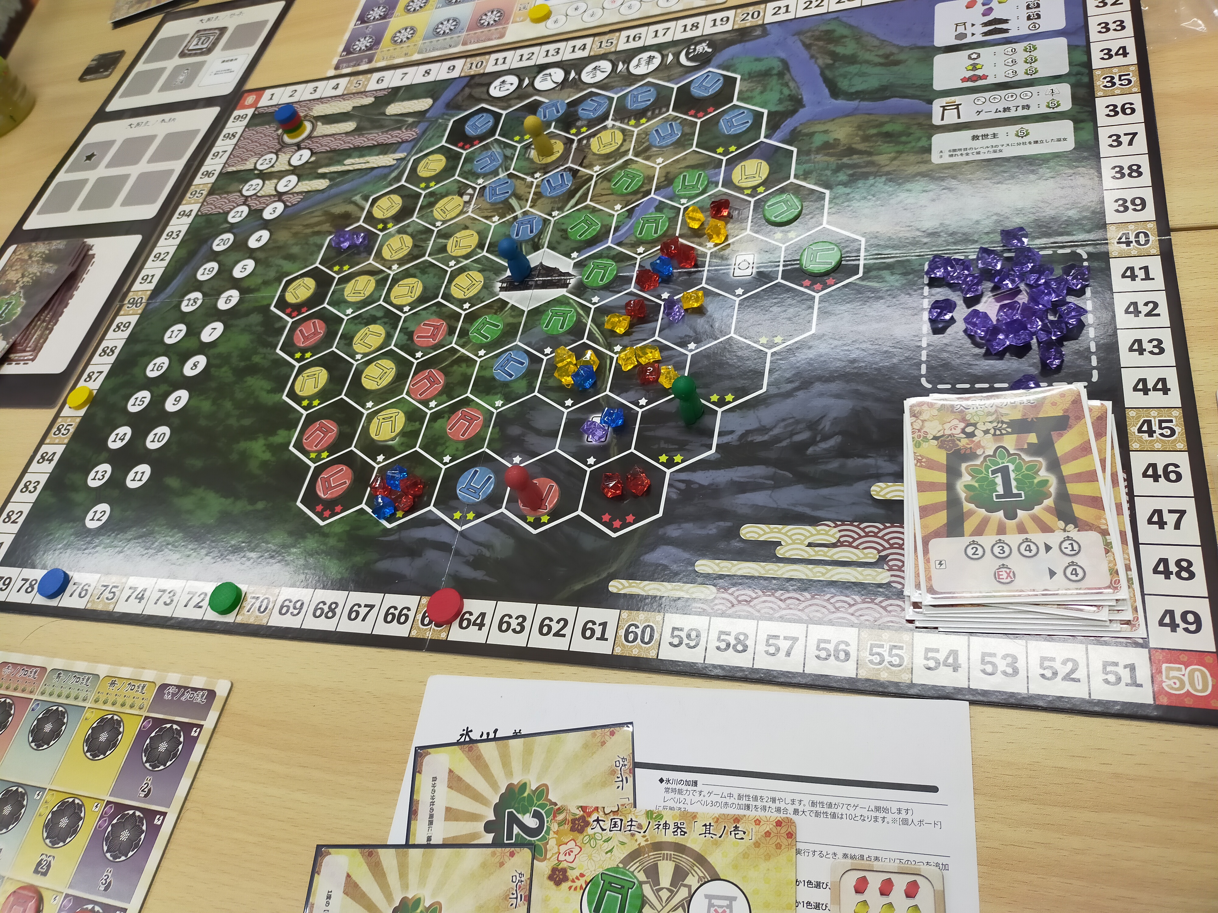 全ての穢れ(色石)を回収するか、外周の角にある星3つのエリア全6ヶ所に社を建てるか、5ラウンド経過したらゲーム終了で得点計算。
