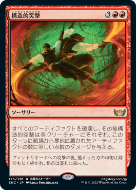 これを使う前に、場と墓地でアーティファクトをループさせていたり、宝物が墓地に行っていたりすると、各クリーチャーへのダメージは大きくなる。