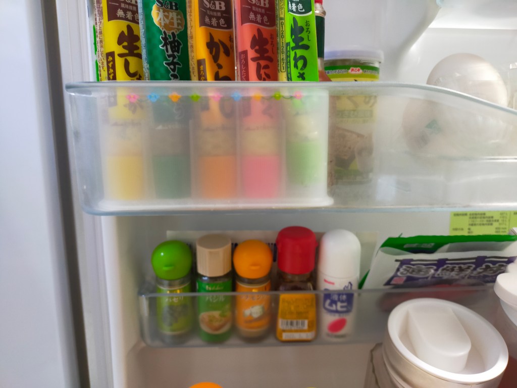 扉側の小物スペースを見ると、パセリ、バジル、シナモン、ラー油、液体ムヒが並んでいた。