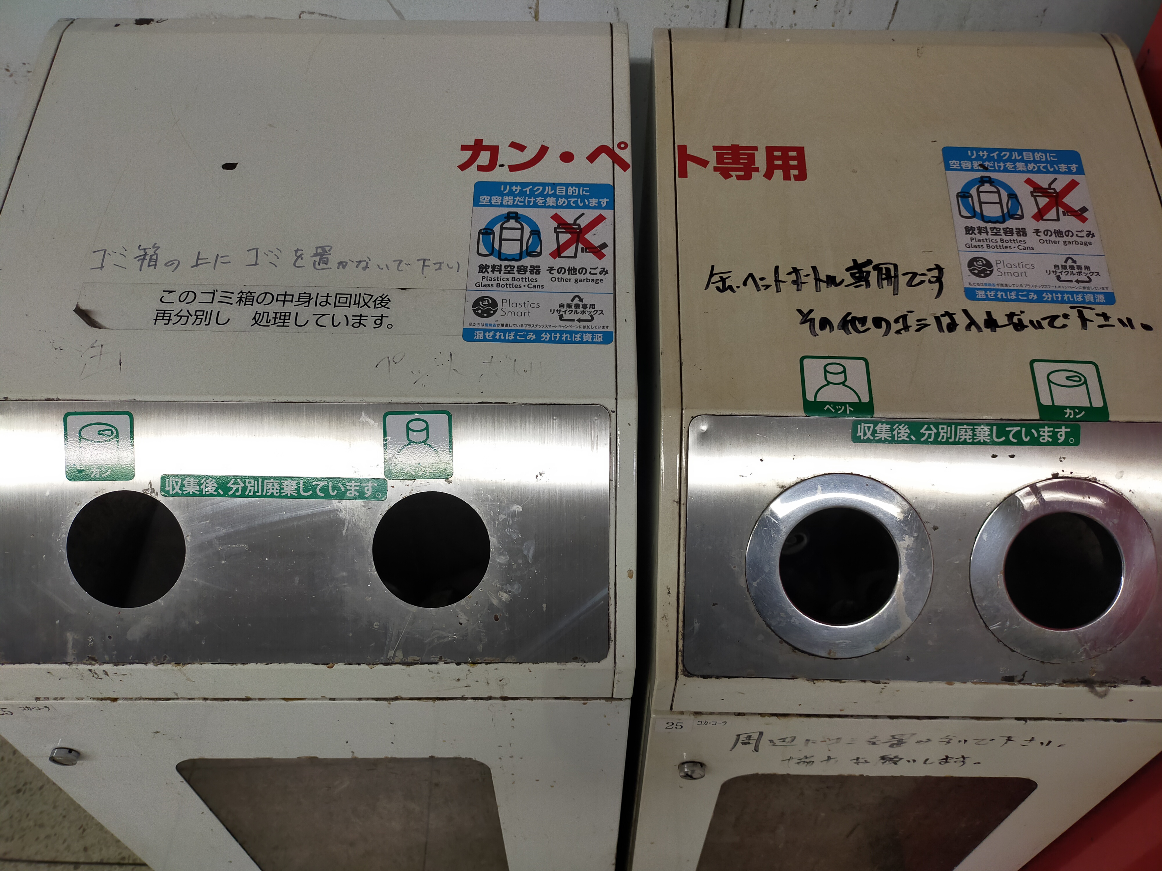 右のゴミ箱に輪っかがハメ込まれているのは、他のゴミを入れられないようにするためだろうか。