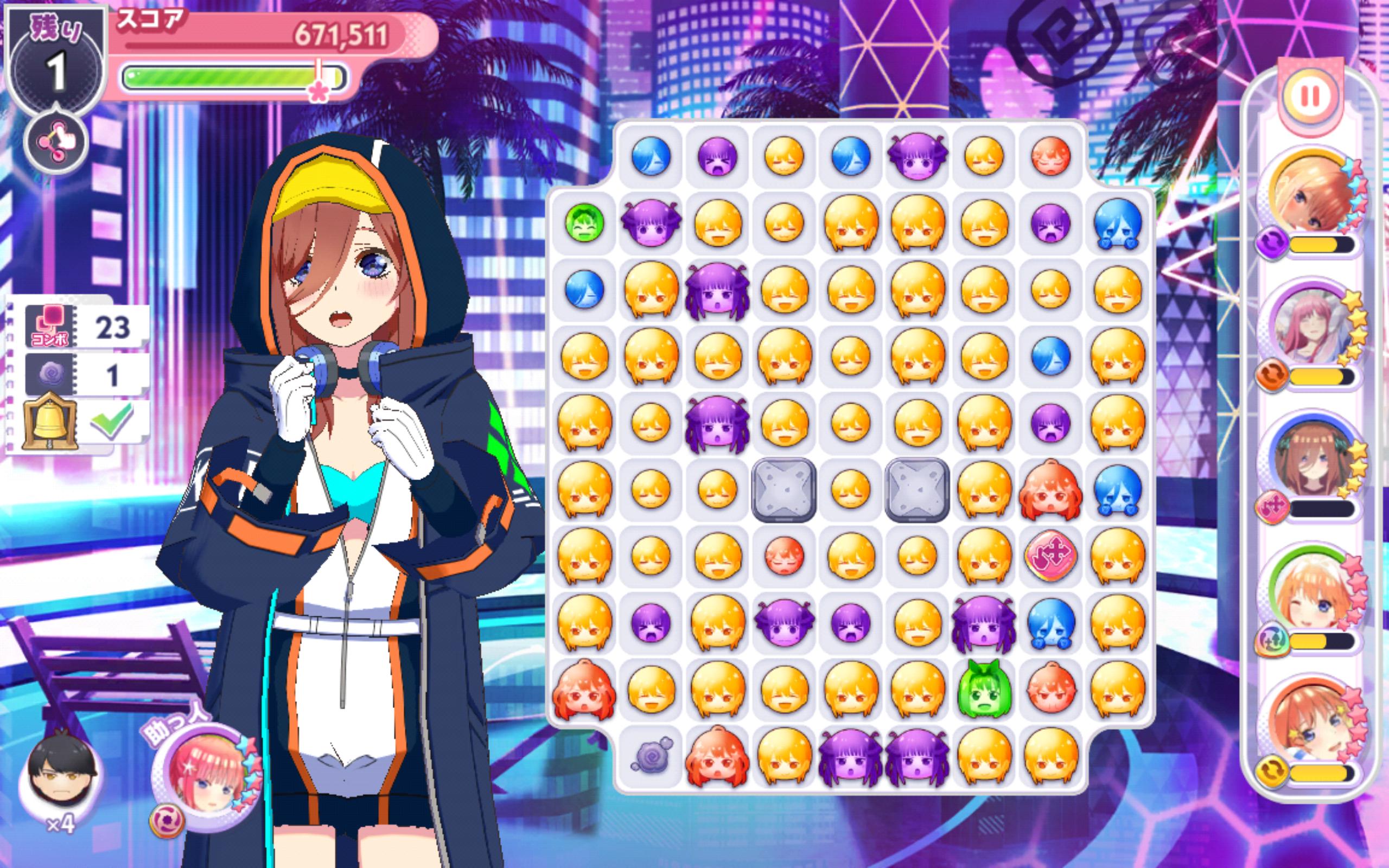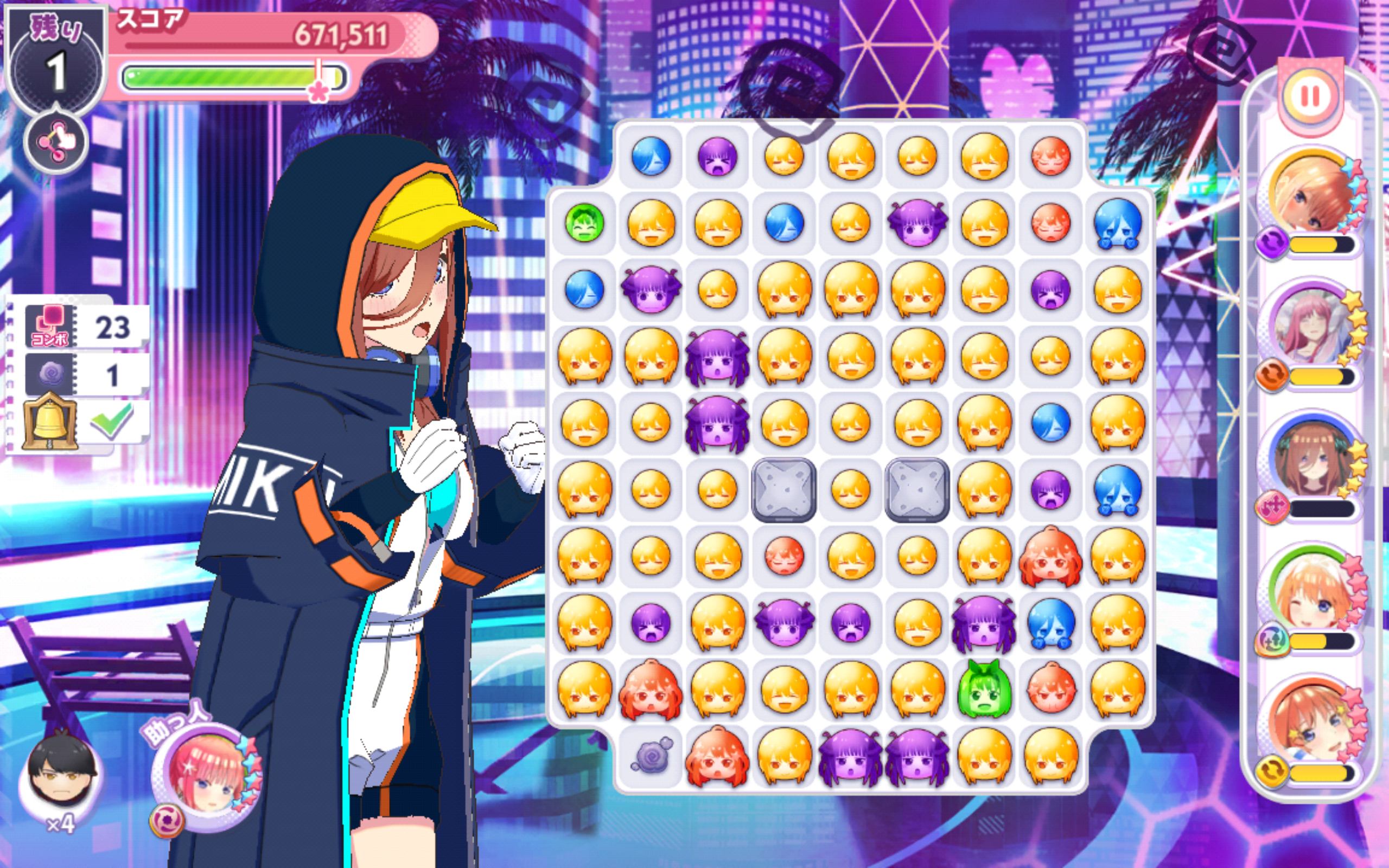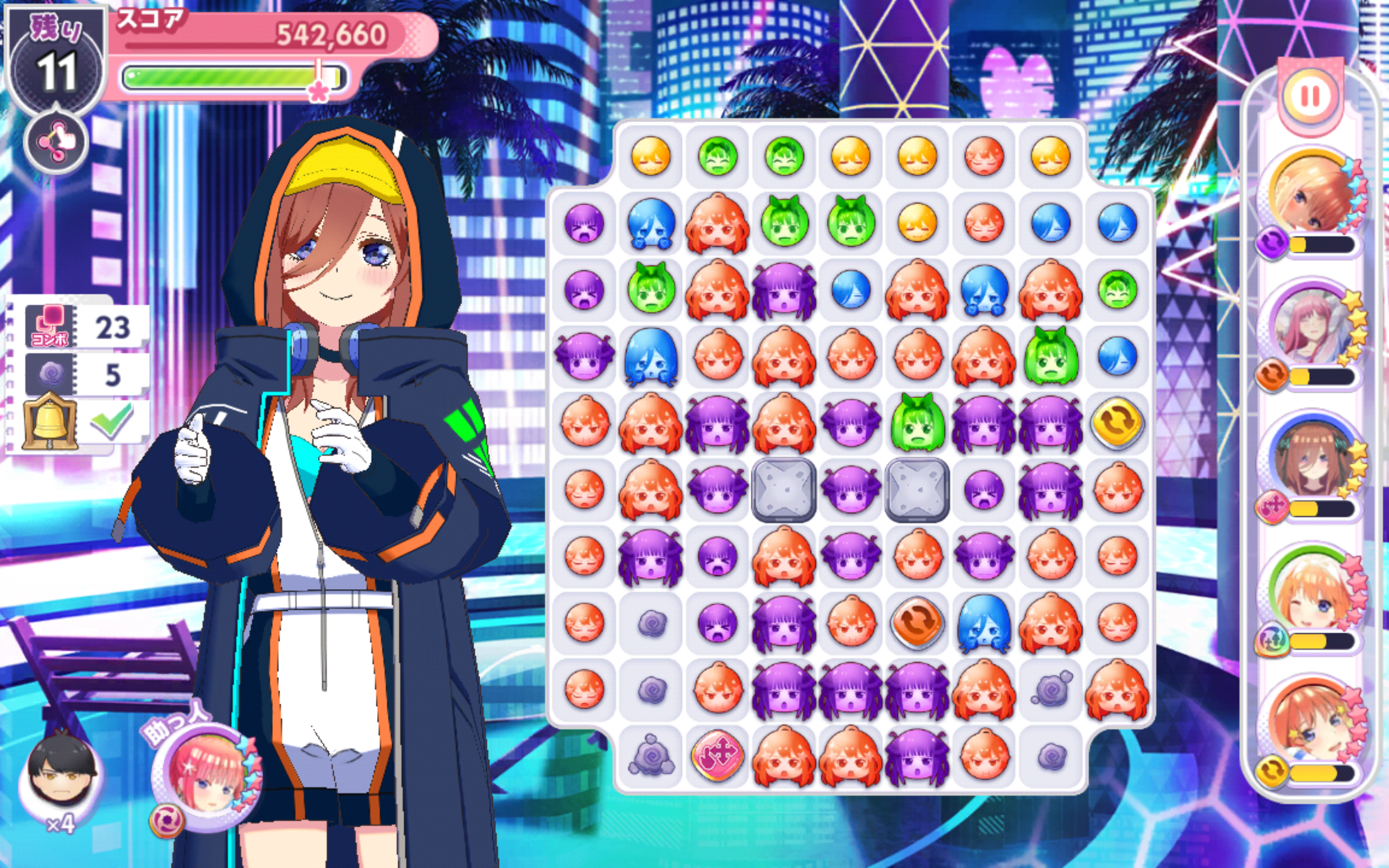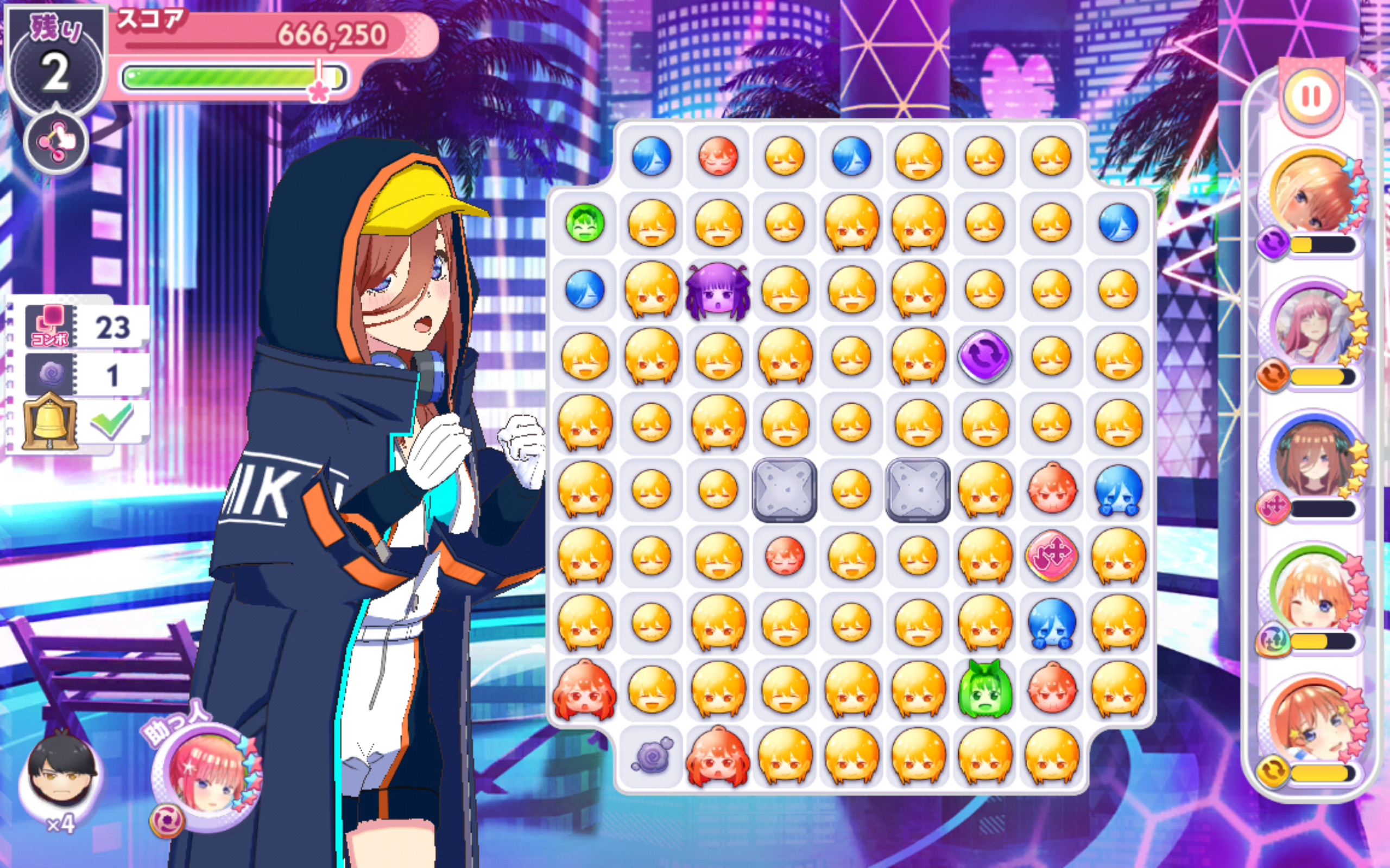 フレンドの助っ人キャラは戦隊大失格コラボ二乃(必要なコンボ数-3)にしておいたので、クリアできる人が増えればいいな。