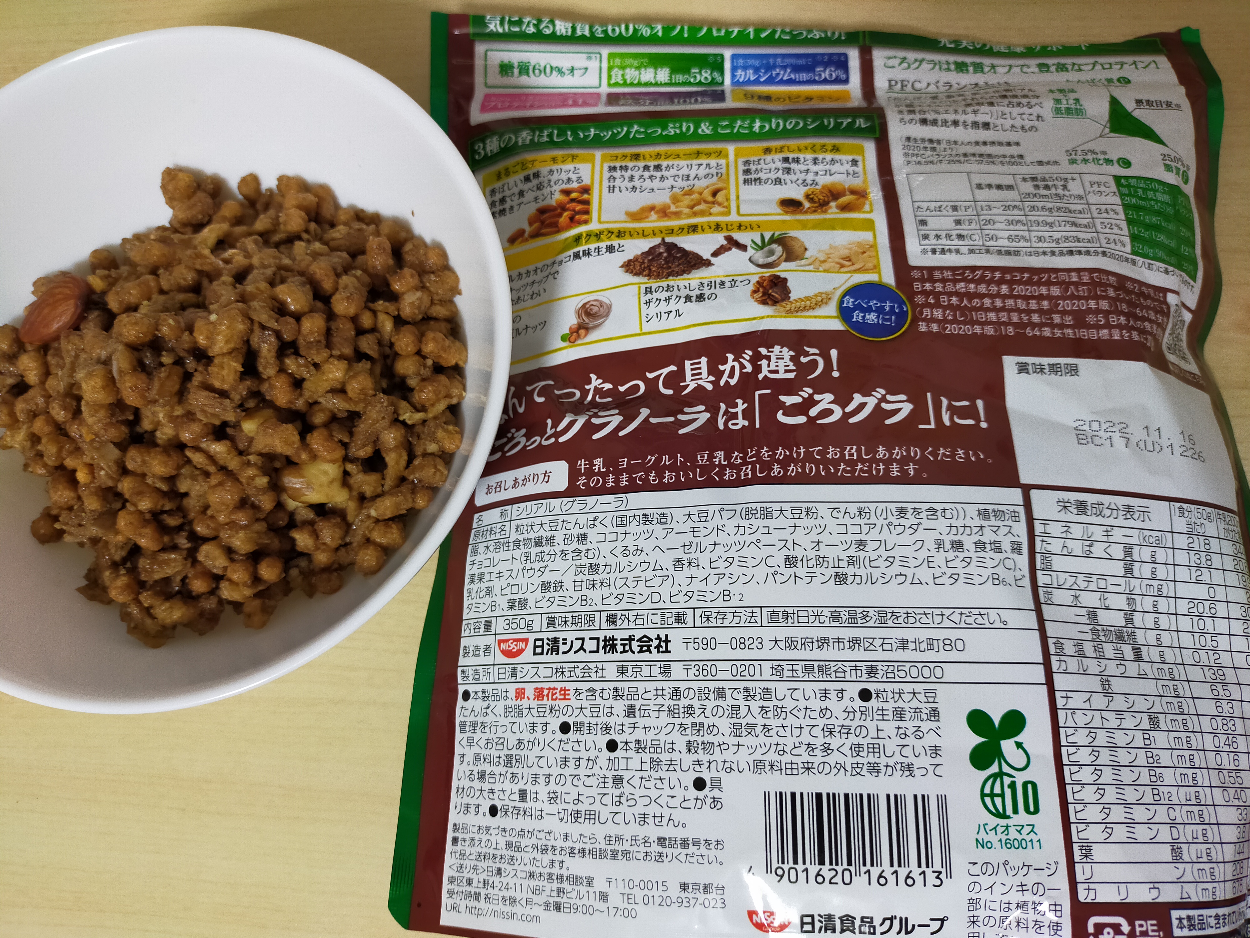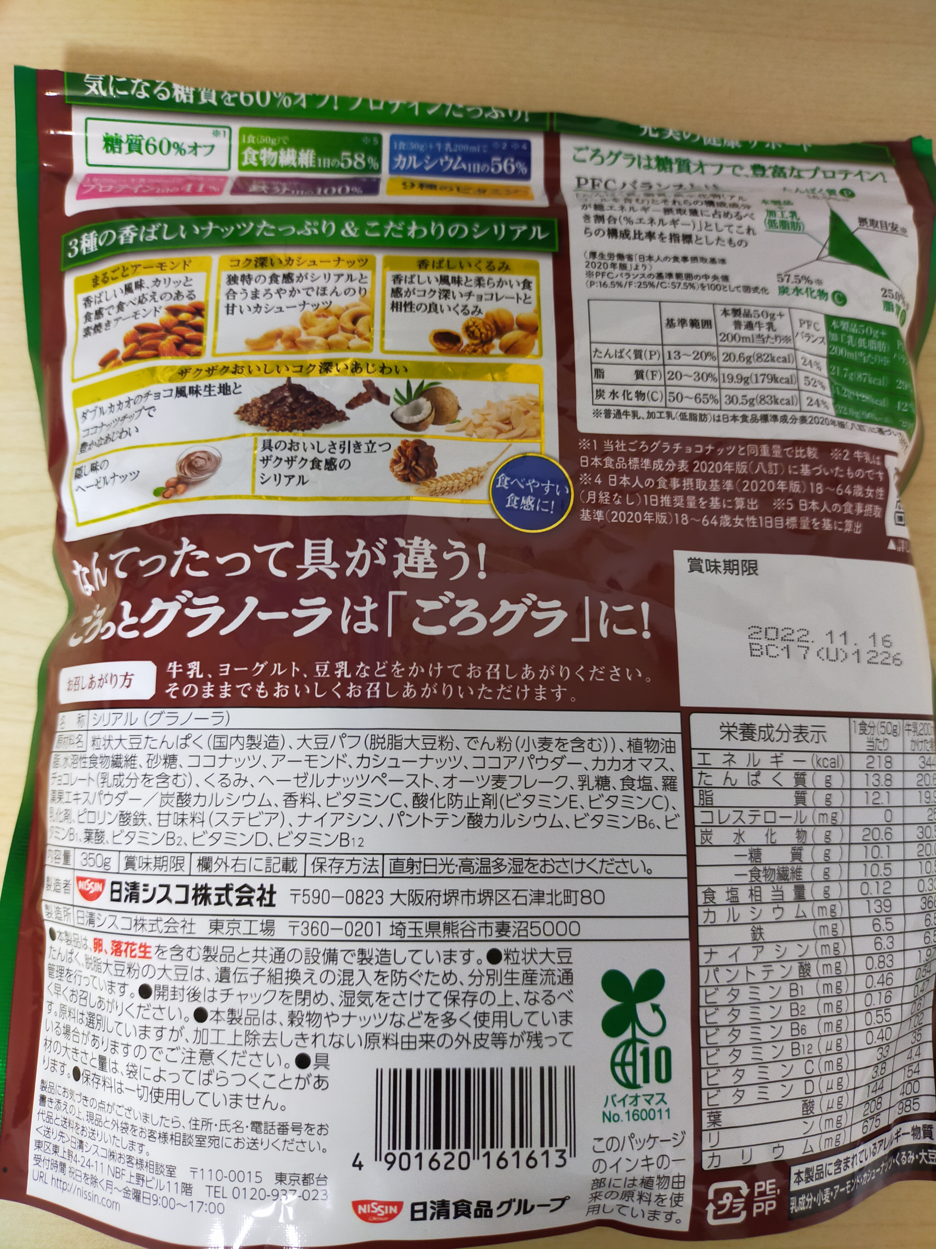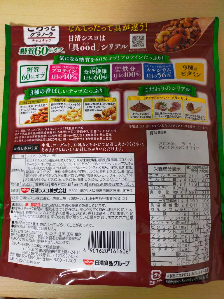 日清シスコのごろっとグラノーラ(チョコナッツ味)は、アーモンド、くるみ、カシューナッツなどが含まれていて好きなのだが、最近パッケージが変わったことに気づいた。