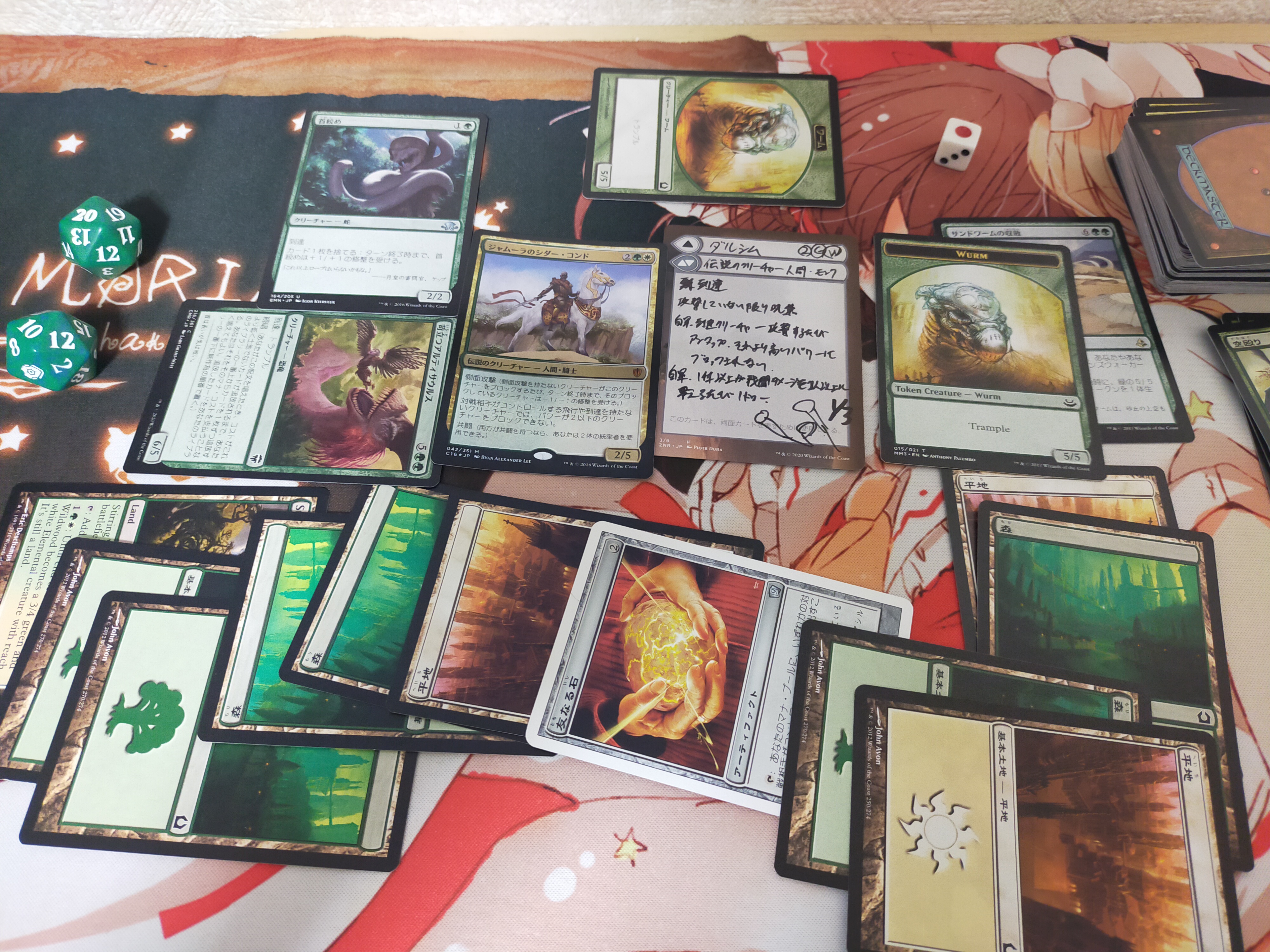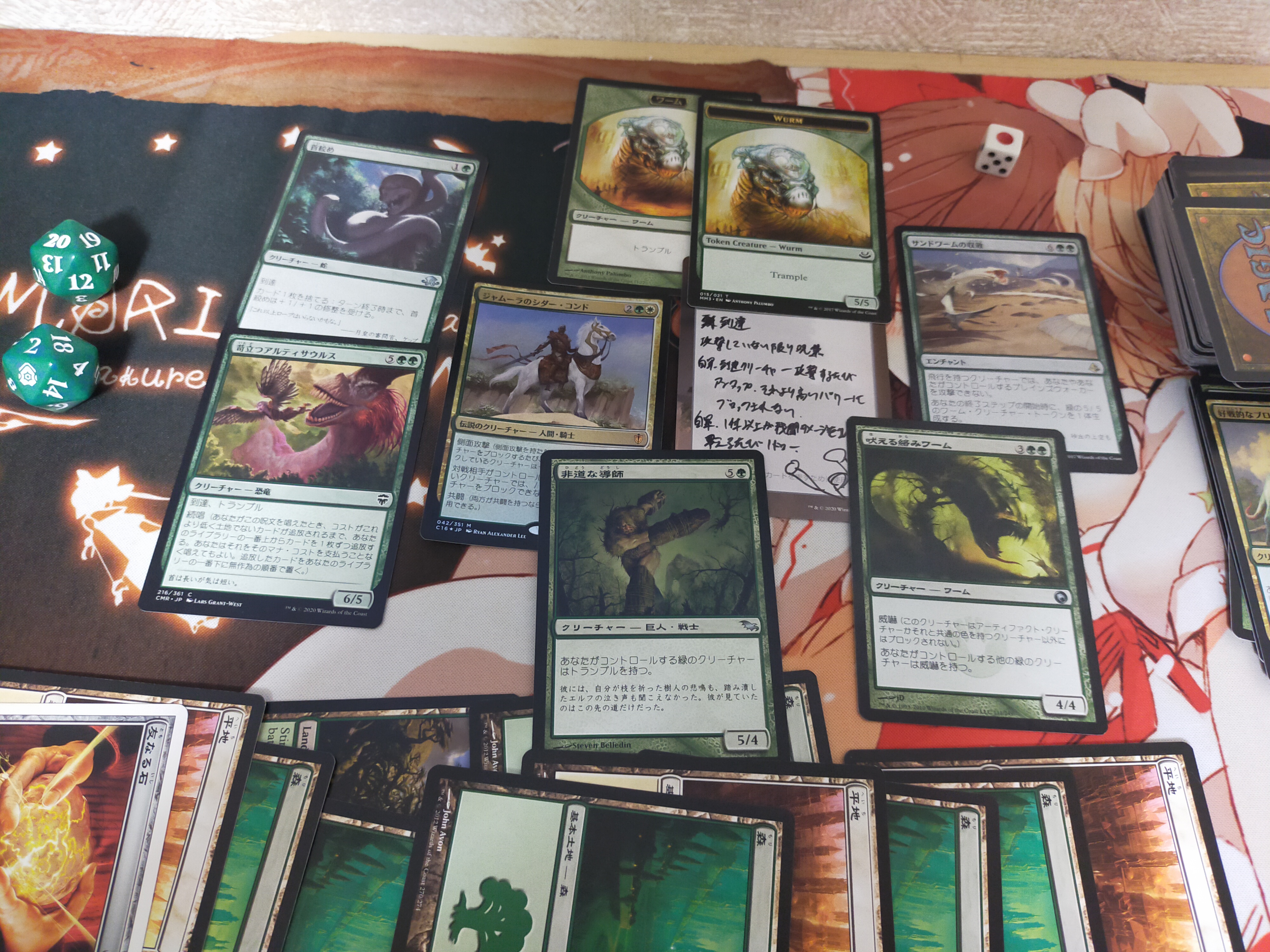 到達もちクリーチャーが全然無かったり、統率の塔や太陽の指輪など必須カードが見当たらなかったり、デッキが95枚しか無かったりしたが、スリーブなしの100枚デッキが完成した。