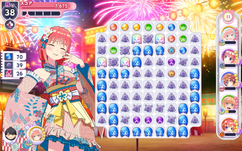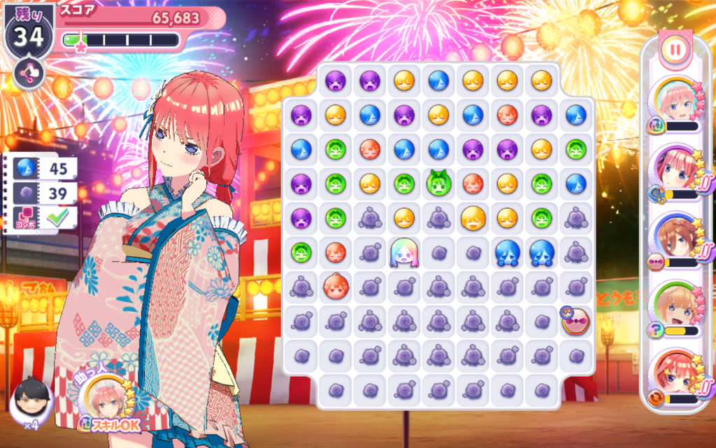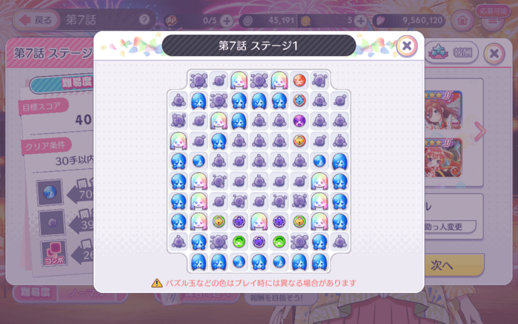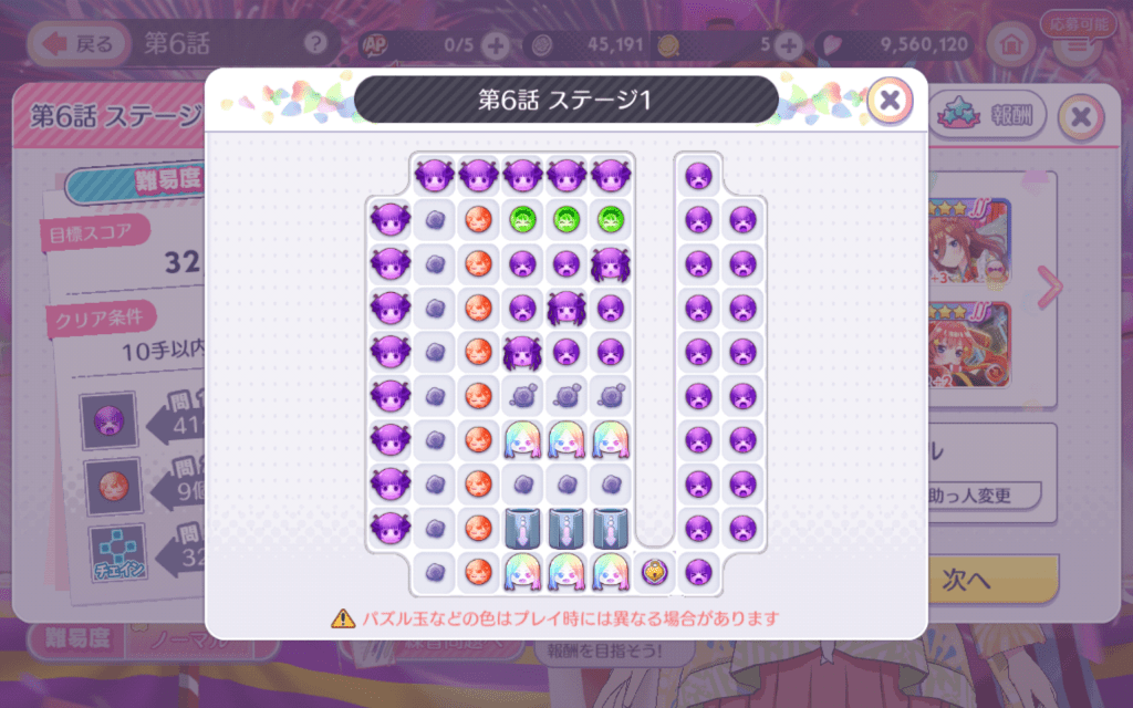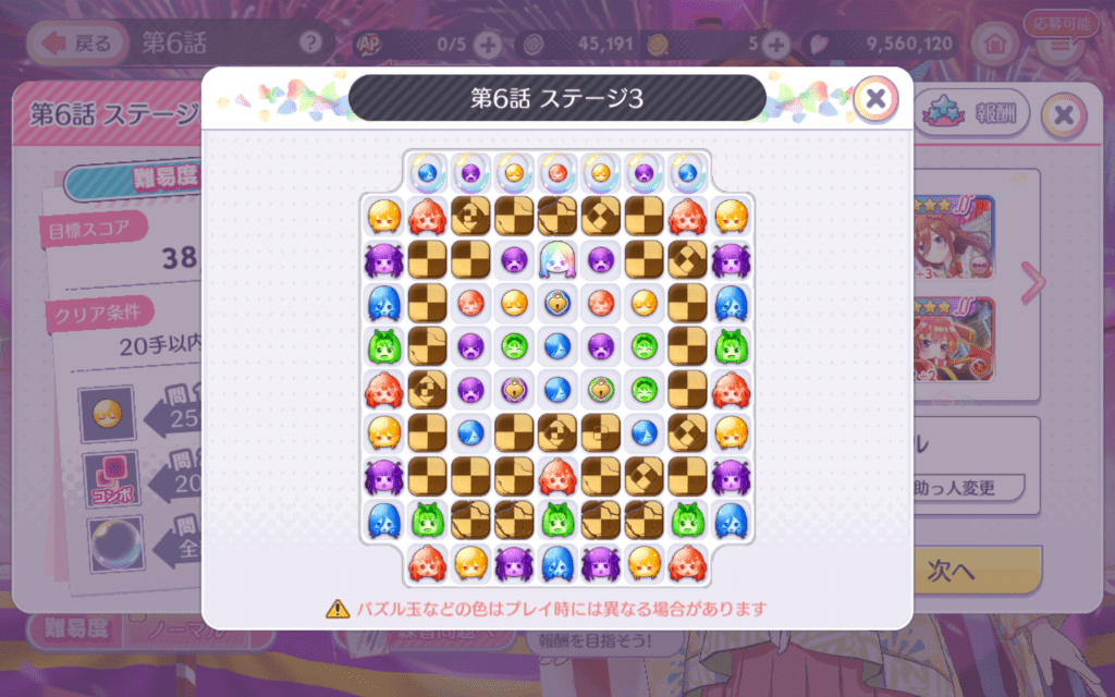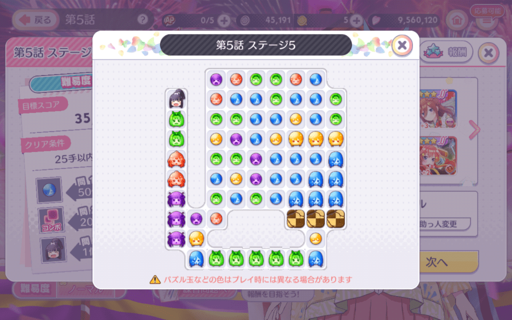 右上の、黄虹紫を消して、レベル3の青玉を25個にする。