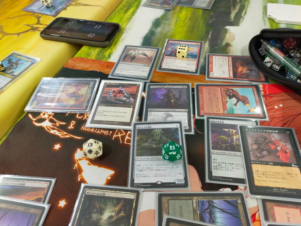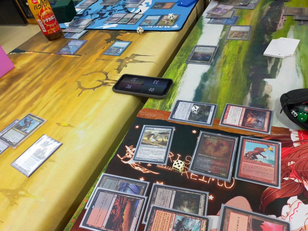 最終的に玄武岩のモノリスが手札に戻り、キナンの無限マナは成立せず、リスティックの研究も残る。