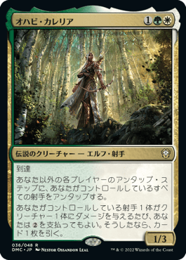 伝説のクリーチャー — エルフ(Elf) 射手(Archer)(T):攻撃しているクリーチャーかブロックしているクリーチャー1体を対象とする。Lady Caleriaはそれに3点のダメージを与える。