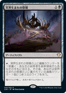 (T),冥界生まれの祭壇の上に魂魄(soul)カウンターを1個置く:あなたの統率者を統率領域からあなたの手札に加える。その後、あなたは冥界生まれの祭壇の上に置かれている魂魄カウンター1個につき3点のライフを失う。