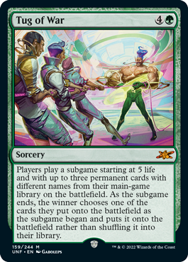 プレイヤーはサブゲームをプレイする。開始時のライフは5ライフで、メインゲームのライブラリーから異なる名前のパーマネント・カードを3枚まで戦場に出す。サブゲームが終了した後に、勝者はサブゲームの開始時に戦場に出したカードから1枚を選び、それを自分のライブラリーに加えて切り直すのではなく、戦場に出す。