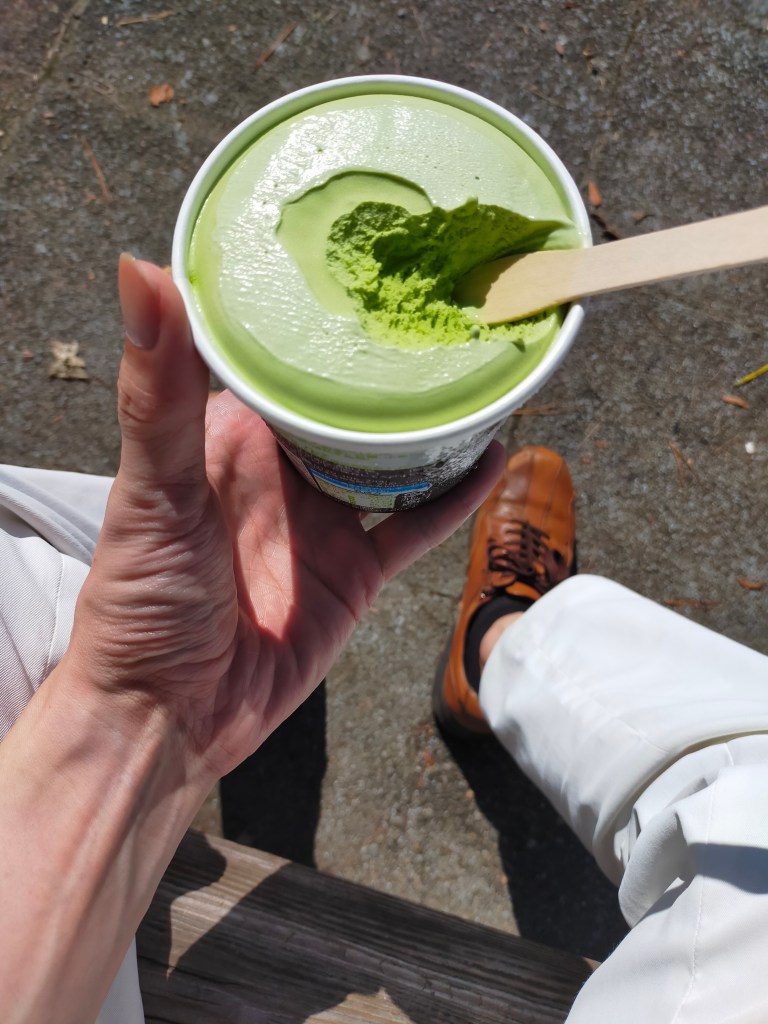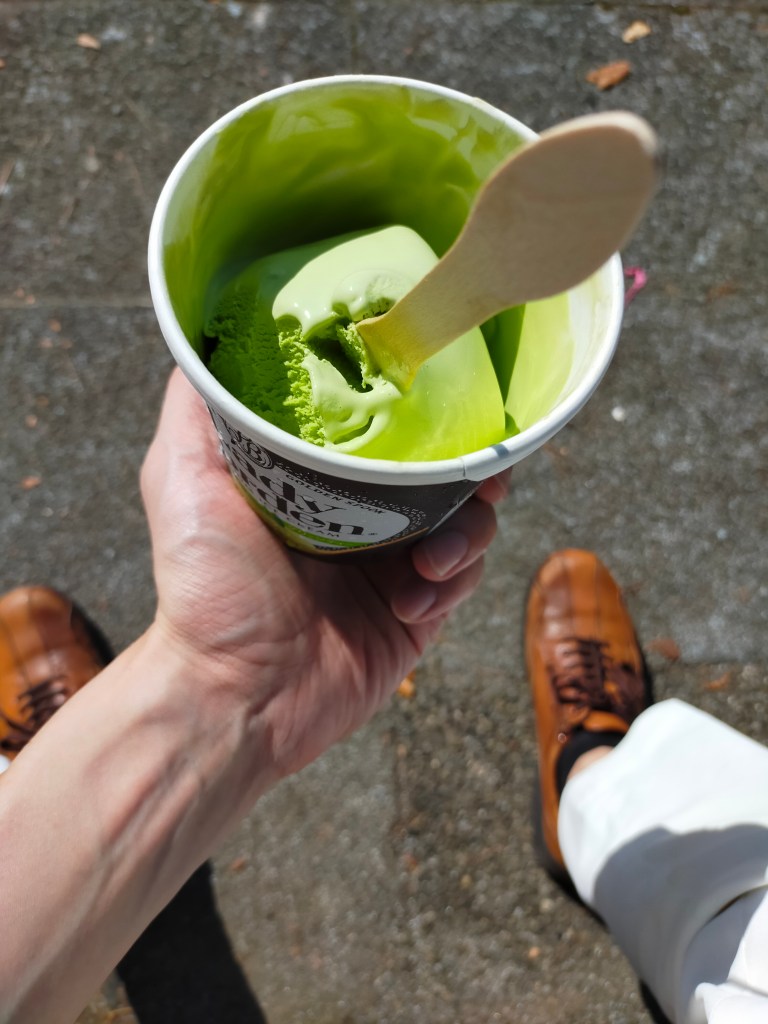 途中から溶けてきたので木製スプーンを刺して、りんご飴のような食べ方をする。楽しい。