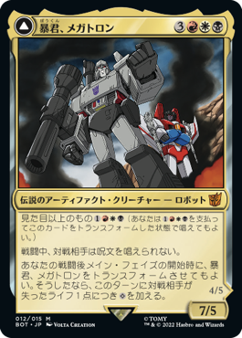 MTGの話。 今回もトランスフォーマーコラボのカード紹介。 前回は味方のメインキャラだったが、今回は敵のメインキャラ。 ●暴君、メガトロン 6マナ7/5で、対戦相手だけ戦闘中に呪文を唱えられない。 戦闘後メイ … 続きを読む 【MTG】EDH「暴君、メガトロン」は、暴動の長ラクドスと差別化できていて楽しそう。