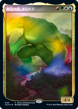 上陸 ― 土地が1つあなたのコントロール下で戦場に出るたび、このターンで初めてこの能力が解決されるなら、あなたは4点のライフを得る。二度目なら、(赤)(緑)(白)(青)を加える。3度目なら、創造の座、オムナスは各対戦相手とあなたがコントロールしていない各プレインズウォーカーに、それぞれ4点のダメージを与える。4/4
