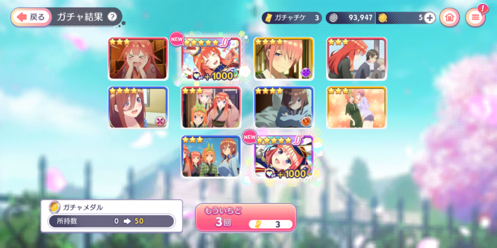 10枚チケットを使った結果、二乃と五月が同時に出た。