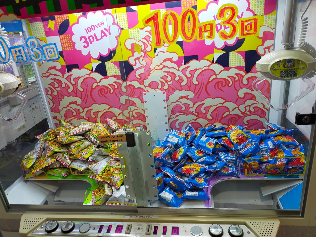 100円3回プレイのクレーンゲームでは1つ30円程度のお菓子が多い。