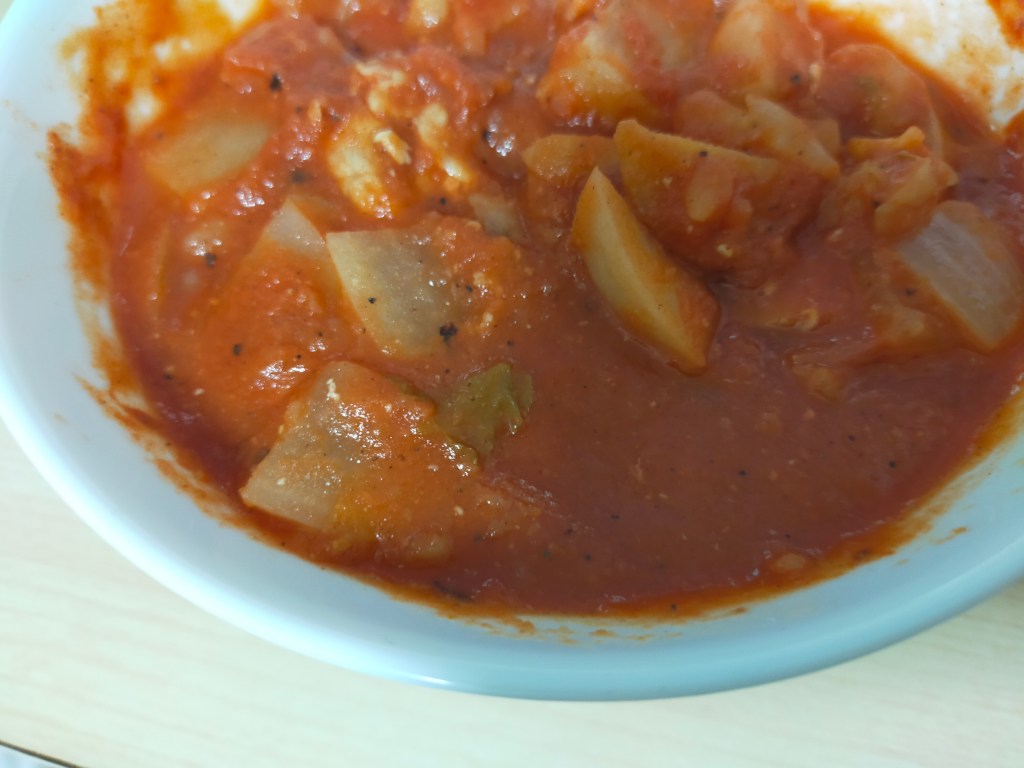じゃがいも、タマネギ、トマト1瓶、豚バラ肉、コンソメはともかく、大根、生姜、ヒハツパウダーのおかげで抜群に温まる。