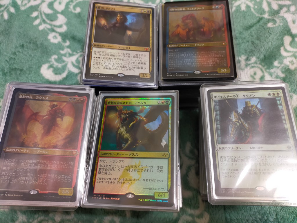 ダリアンは白メダル、アタルカは花の絨毯+呪われたトーテム像、ラクドスは赤ダイヤモンド、ダクソスは白黒タリスマン、フィルクラーグは島セットのみ。