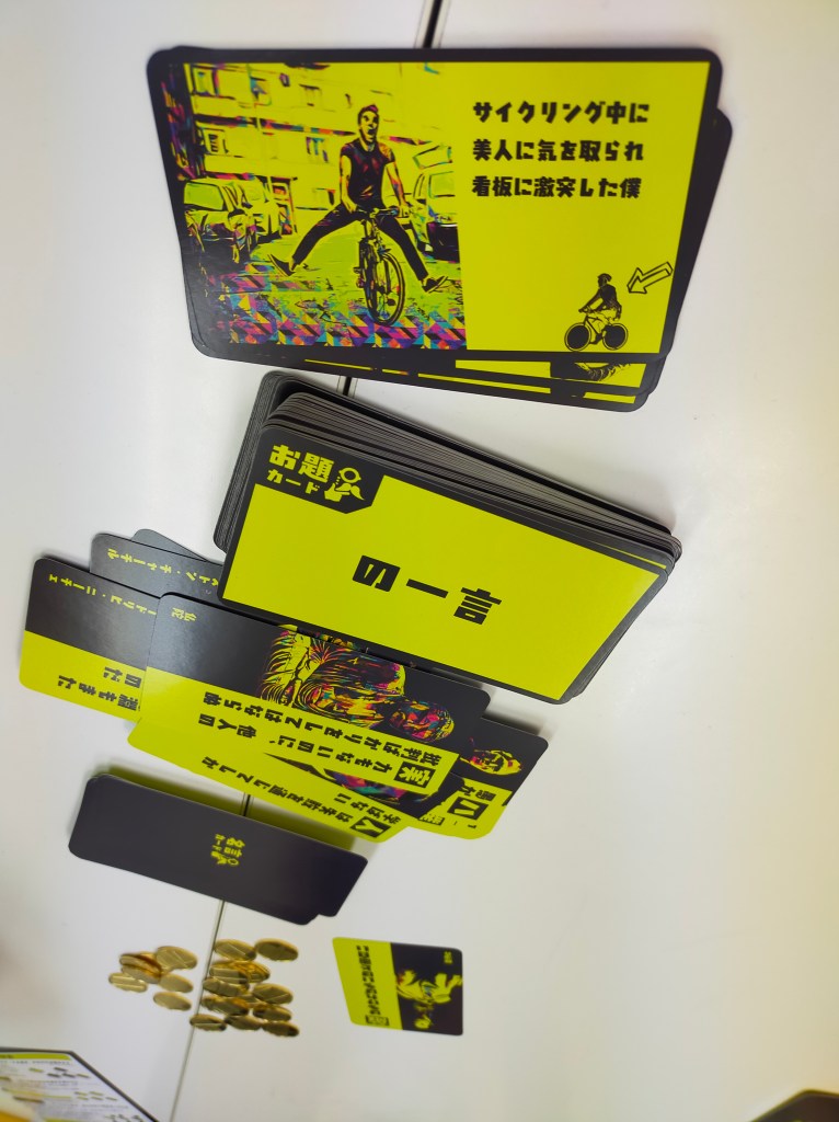 次のラウンドではお題カードを1枚めくって、全員1枚ずつ引いて同じことを繰り返し、3点先取した人の勝ち。