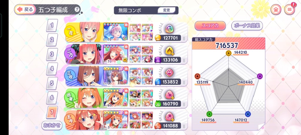 一花から順に、周囲3マスレベルアップ、黄色ゲージ30アップ、2手の間黄色のみ補充、手数3アップ、1手の間コンボ+5、の編成。