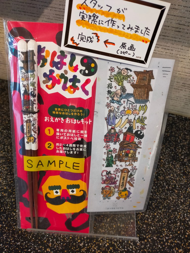 専用の用紙に絵を描いて、箸と一緒に郵送すると、持ち手の白い部分に印刷されて戻ってくるらしい。1セット2,200円。