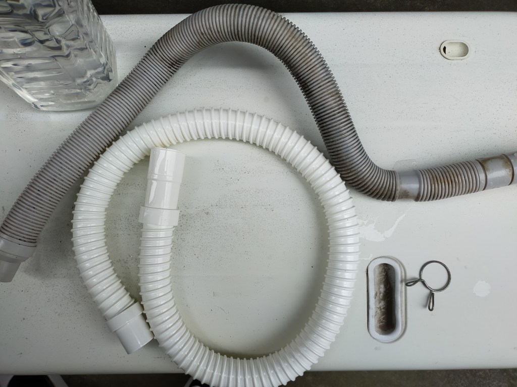 調べてみたところ、ホースを外し、先端をラップと輪ゴムでフタをして、50倍で薄めたハイターを入れて、もう片方もフタをして放置、という流れらしい。