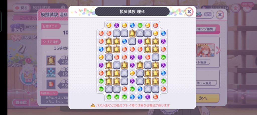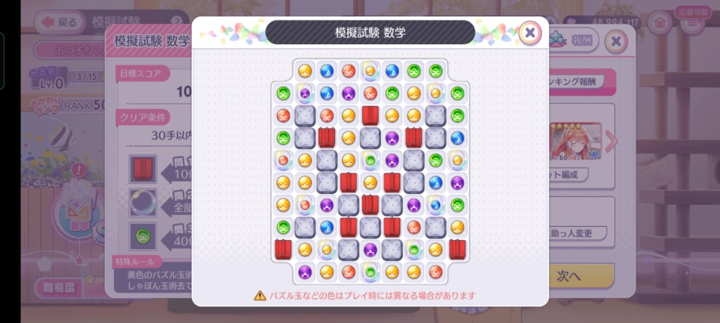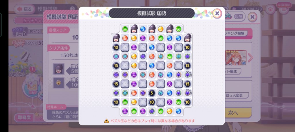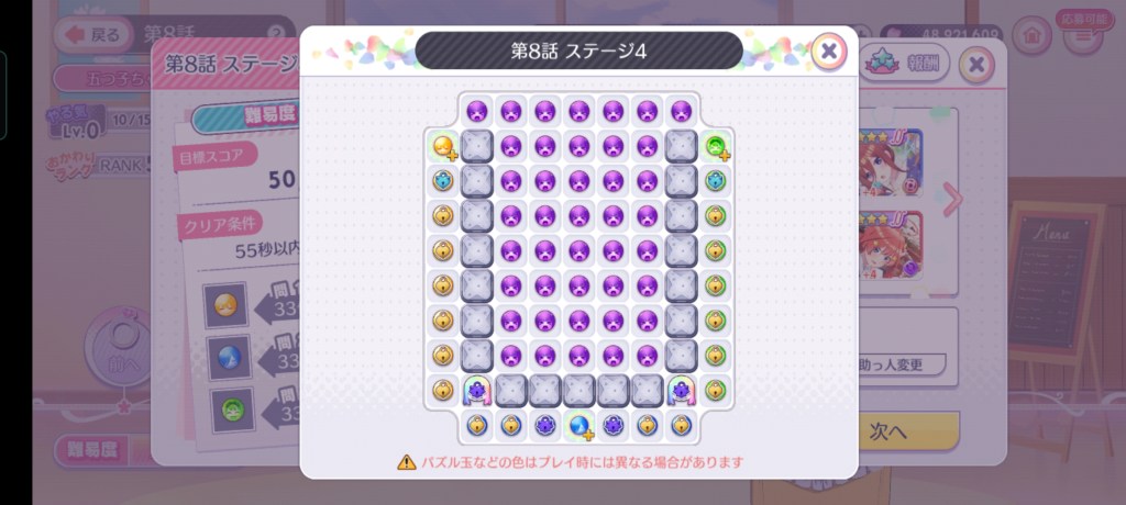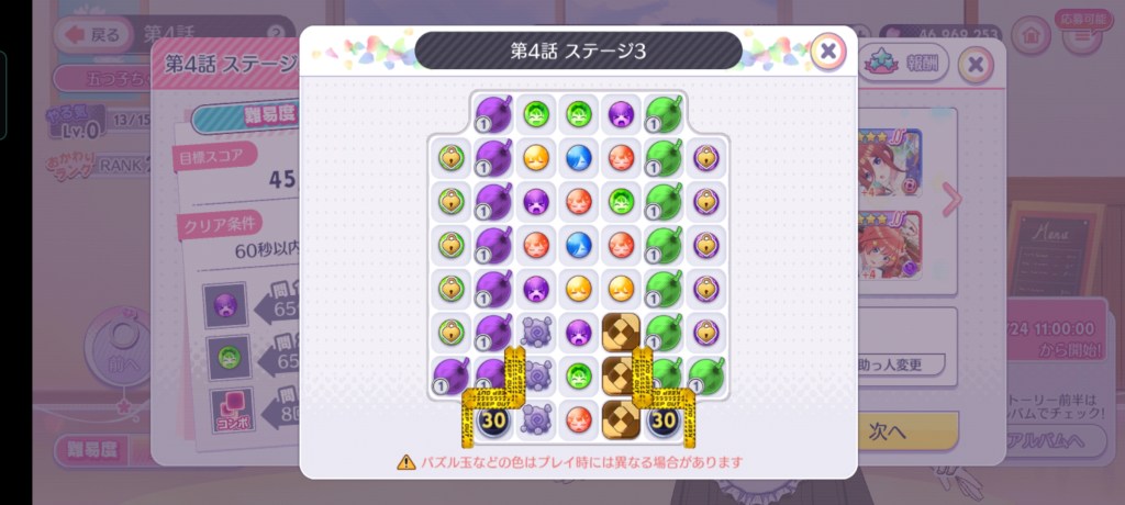 55秒以内に、黄、青、緑を33個以上消せというクリア条件。