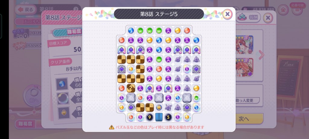 色箱も花火玉も「隣接して消すお邪魔ギミック」という点では同じだが、少なくとも目標スコアが違うので別ステージと言える。