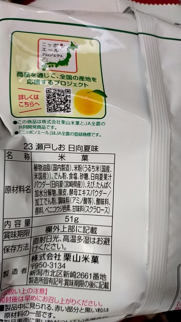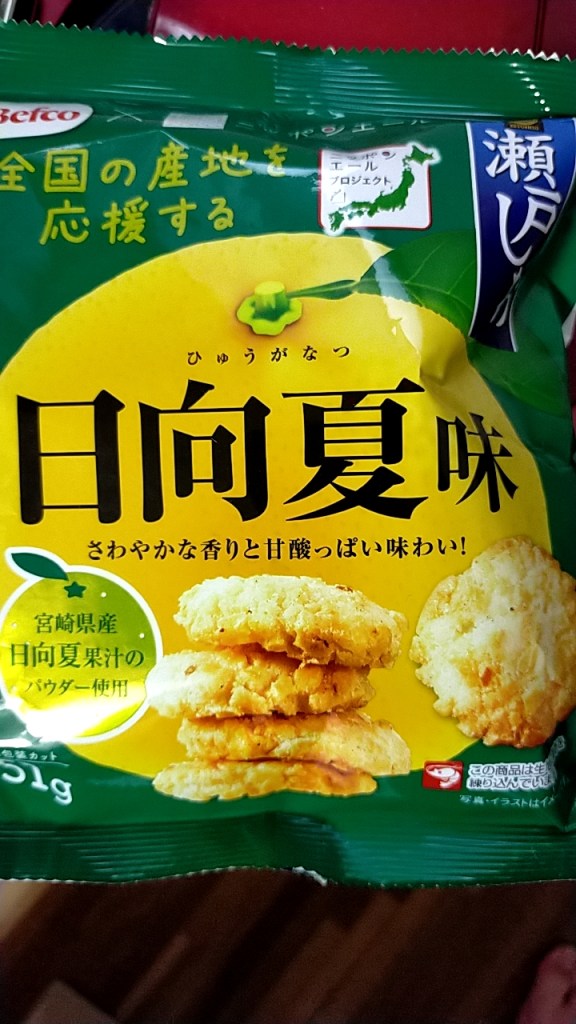 柑橘系の香りに違和感があるが、味はしょっぱい米菓なので普通に食べられるが特筆する点は無い。