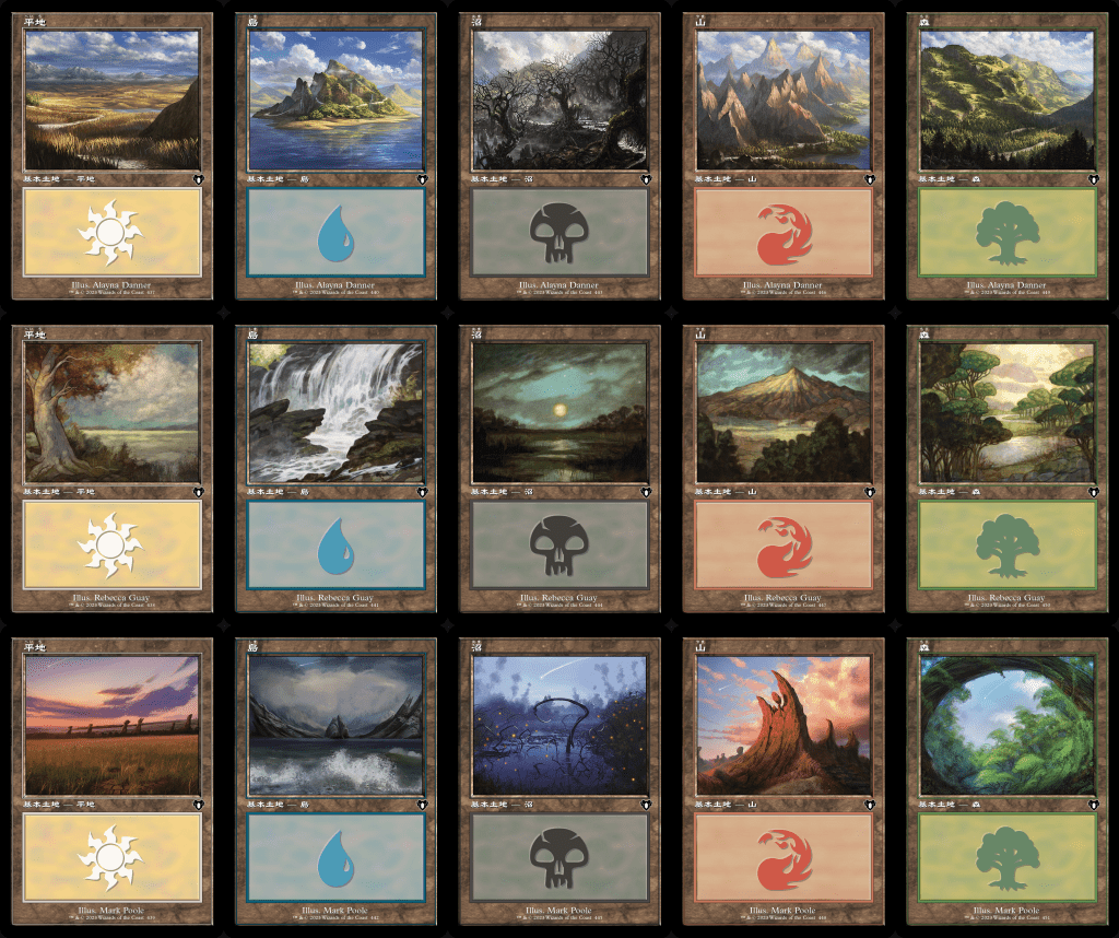 それぞれ3人のアーティストが基本土地5種を描いているため、絵師単EDH界隈では歓喜していることだろう。そんな界隈があるかは知らないが。