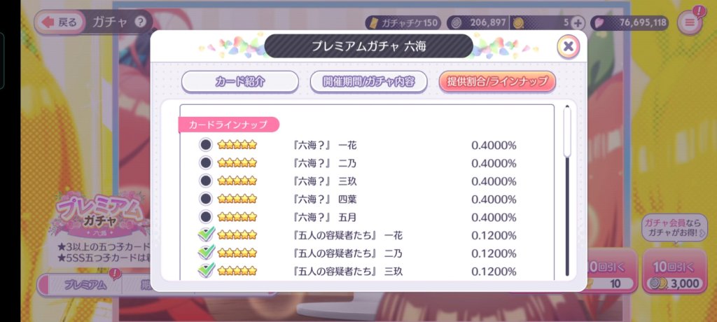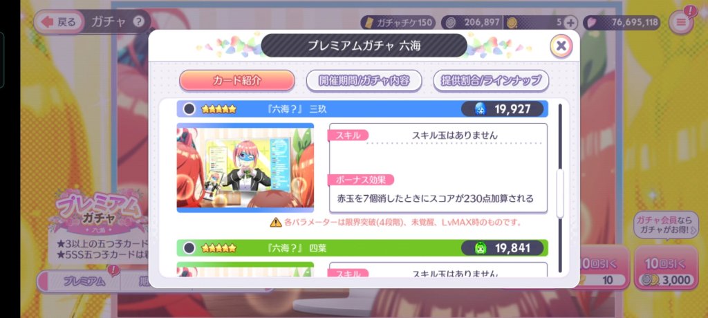 プレミアムガチャはアニメ2期の星3から星5のカードが出てくるのだが、全て持っているため、ガチャを回さないでいたらチケットが結構溜まっていた。
