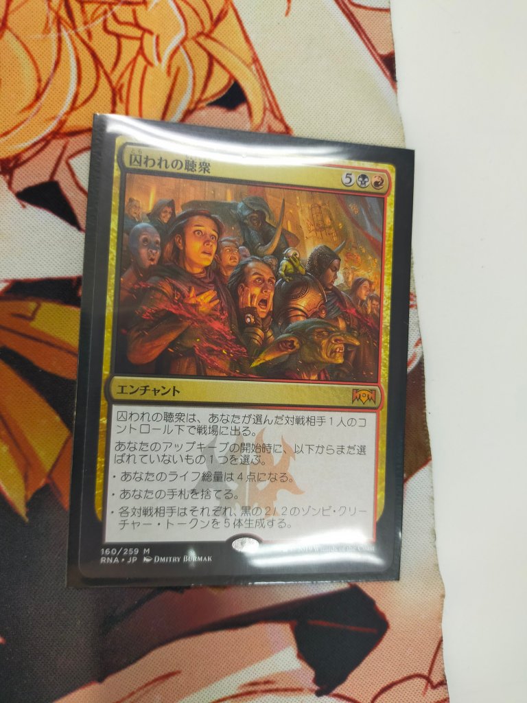 エンチャント囚われの聴衆は、あなたが選んだ対戦相手1人のコントロール下で戦場に出る。