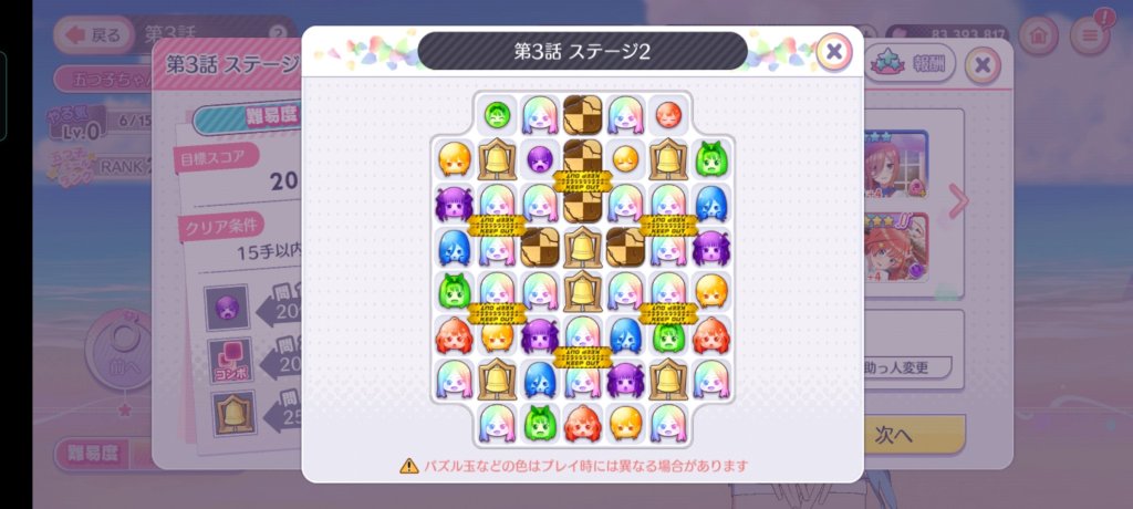 左右にお膳立てしてあるレベル3玉を10コンボクリアに使いたくなるが、普通に縦に消して、クッキーを破壊してワープを稼働させよう。