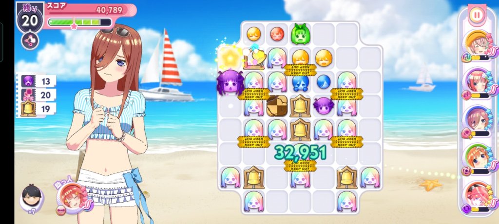 ※右上のベルは2回接触させれば消えたので、初手から右上の紫虹黄をL字で消せばそれでベルを破壊できていたはず。