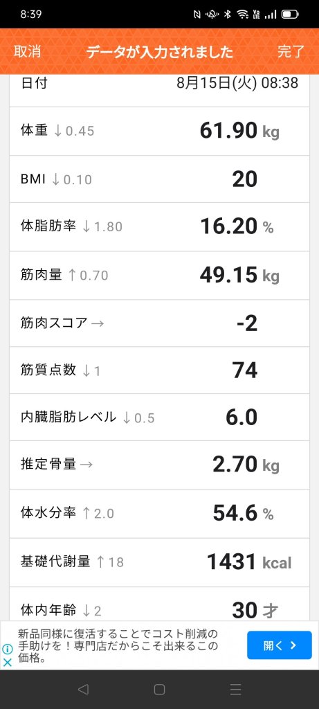 体重や筋肉量に悪影響は無いのでヨシ。