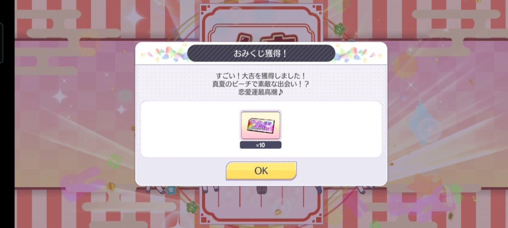 この上に花嫁大吉という0.01%の結果(報酬はチケット55枚)があるのだが、1万人に1人って、このゲームのユーザーはどれくらい居るのだろうか?