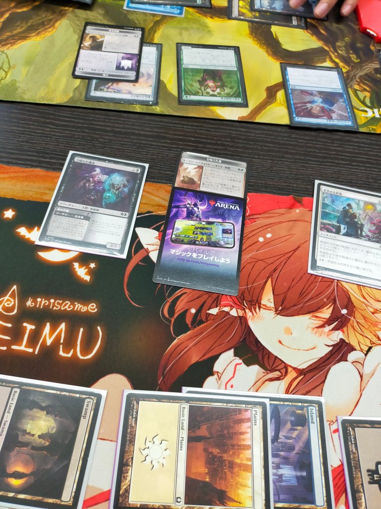 毎ターンドローやトークン生成でアドをとりつつ、出来事の除去を使うが、1マナで呪禁付与をされそうになり、出来事の呪文バウンスで手札に戻す(その後、マナが無かったので再キャストされなかった)。