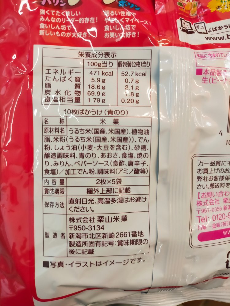 ざっくりと計算してみると、10袋で527kcal(100gで471kcal)なので、一袋5袋入りなら半分の50gそこそこ(約56g入り)と分かる。