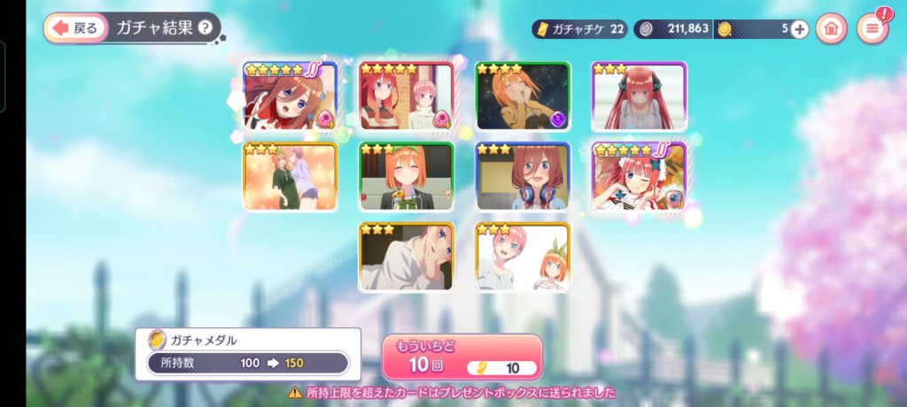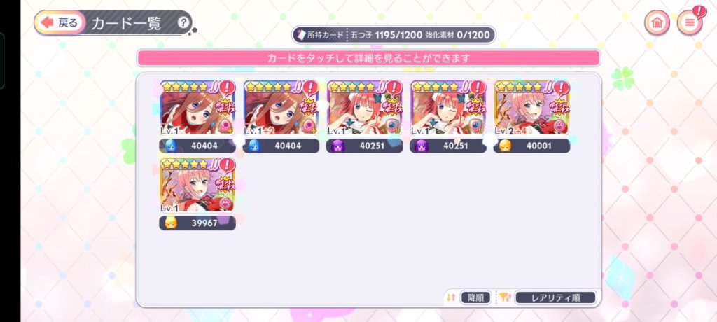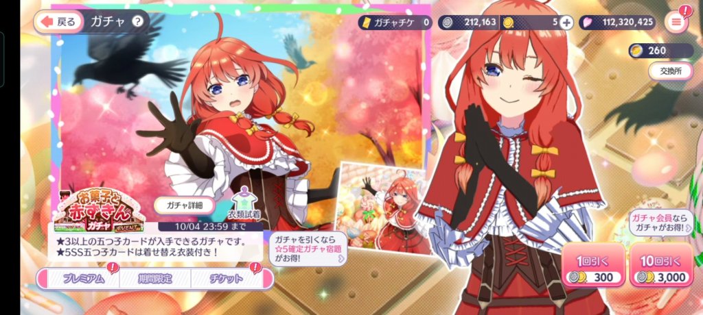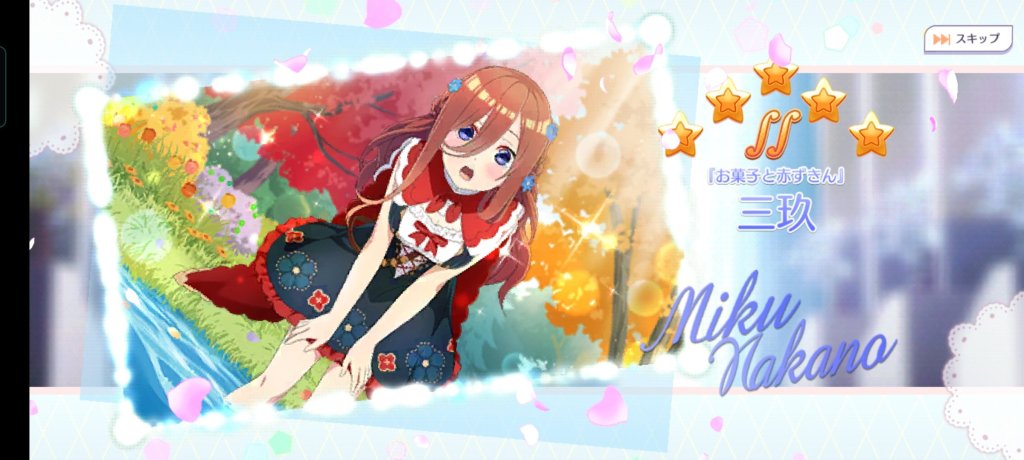 今回は、イベント開始前の無料ガチャで、三玖と一花を引いており、幸先がいい。