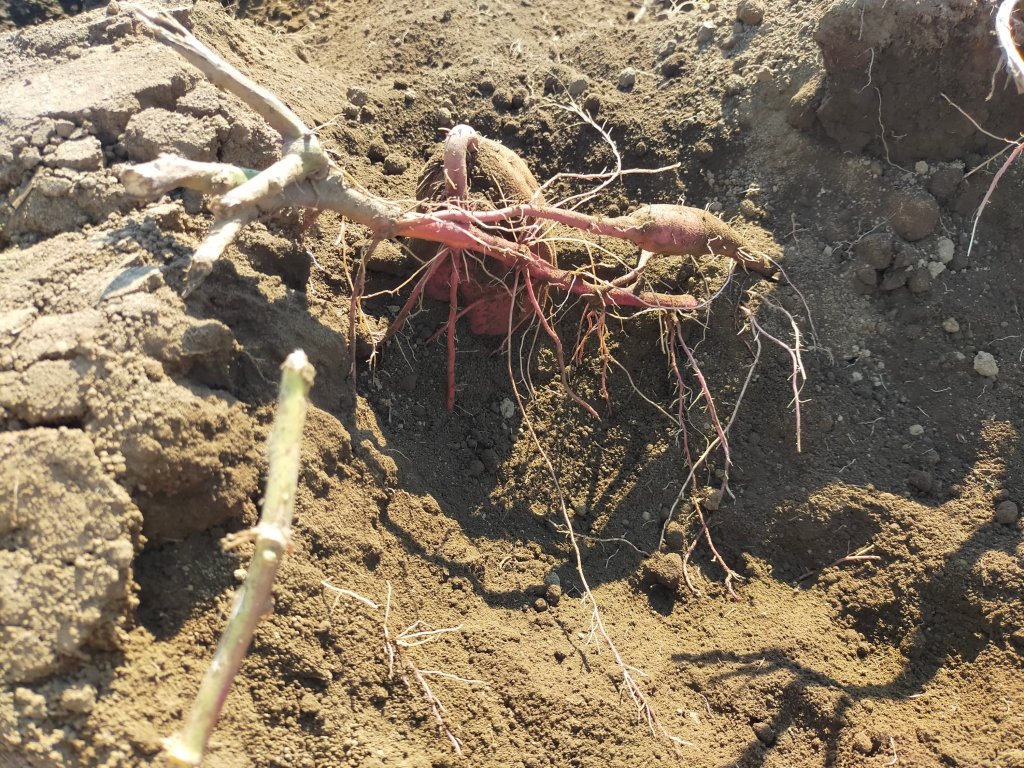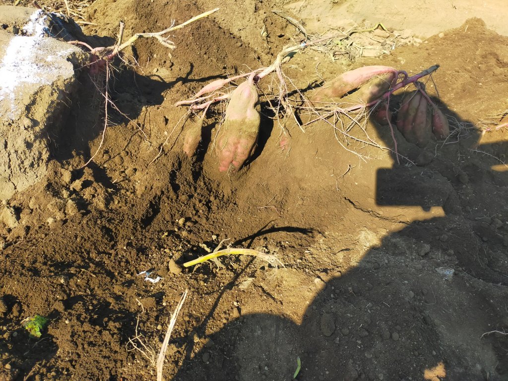 写真上方にある草のようなものは、サツマイモのツルや根っこ。
