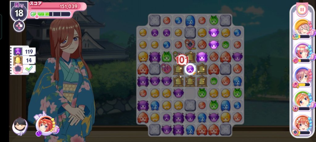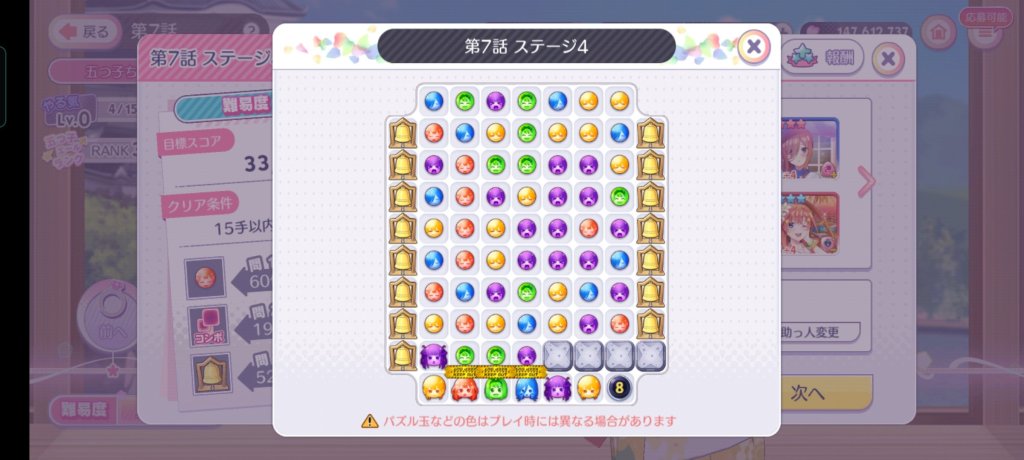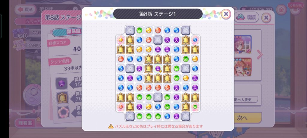 クリア条件は33手以内で、紫150個、ベル76回鳴らす、桜玉すべて消す。