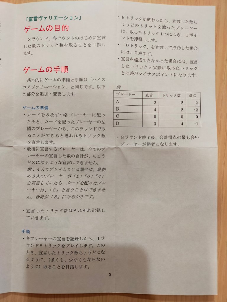 さらに、各ラウンドの始めに宣言したトリック数を取ることを目的とした「宣言ヴァリエーション」というルールもある。