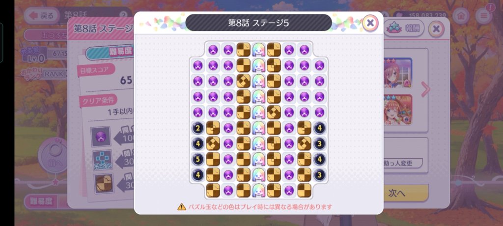 クリア条件は、1手以内で、紫100個、30チェイン、クッキー30個を全て破壊。