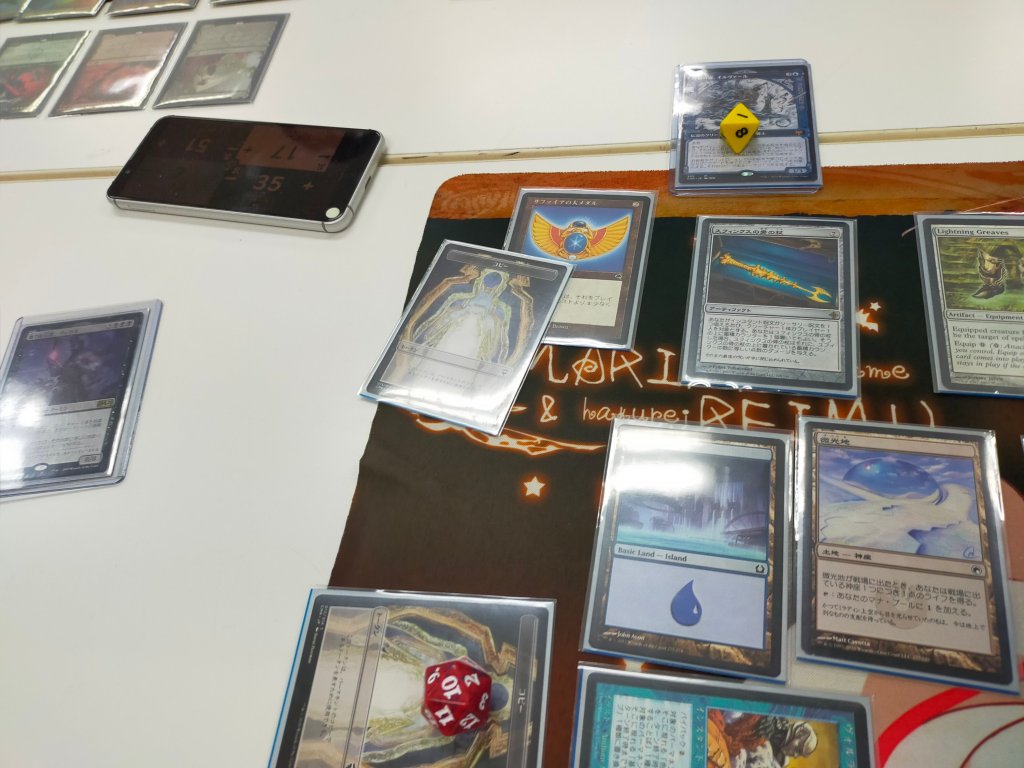 イドリスがヤケを起こして破滅的な行為で5以下を破壊し、均衡が崩れ(私のパーマネントが5つ減った)再鍛の黒き剣とエンバレスの宝剣を装備したデアリガズの勝ち。
