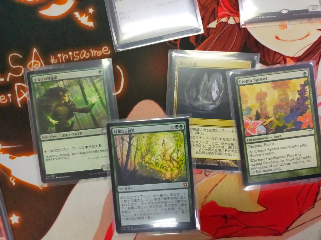 コピー含めて2体出たので、薬瓶砕きと逆嶋コピーの薬瓶砕き、ジョダーの5マナ出るアーティファクトと彩色の灯籠、白と緑の小粒クリーチャー、を宝物にした。
