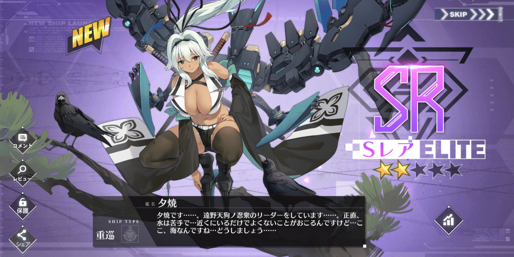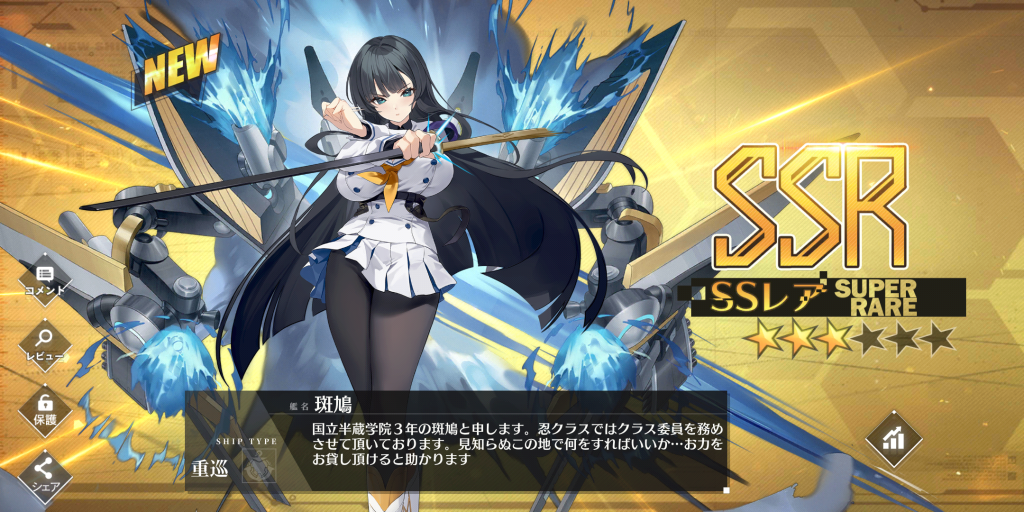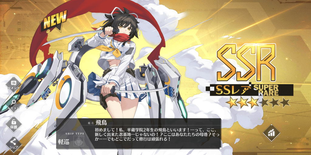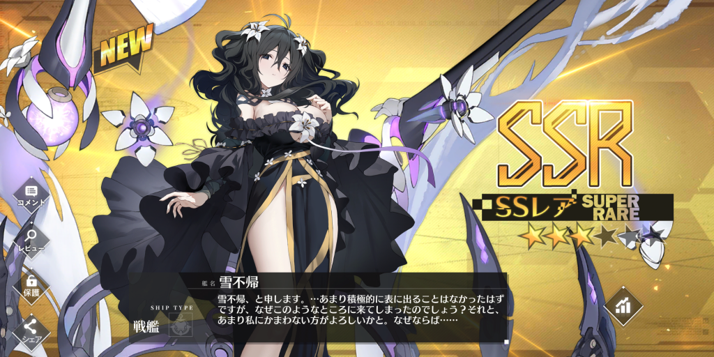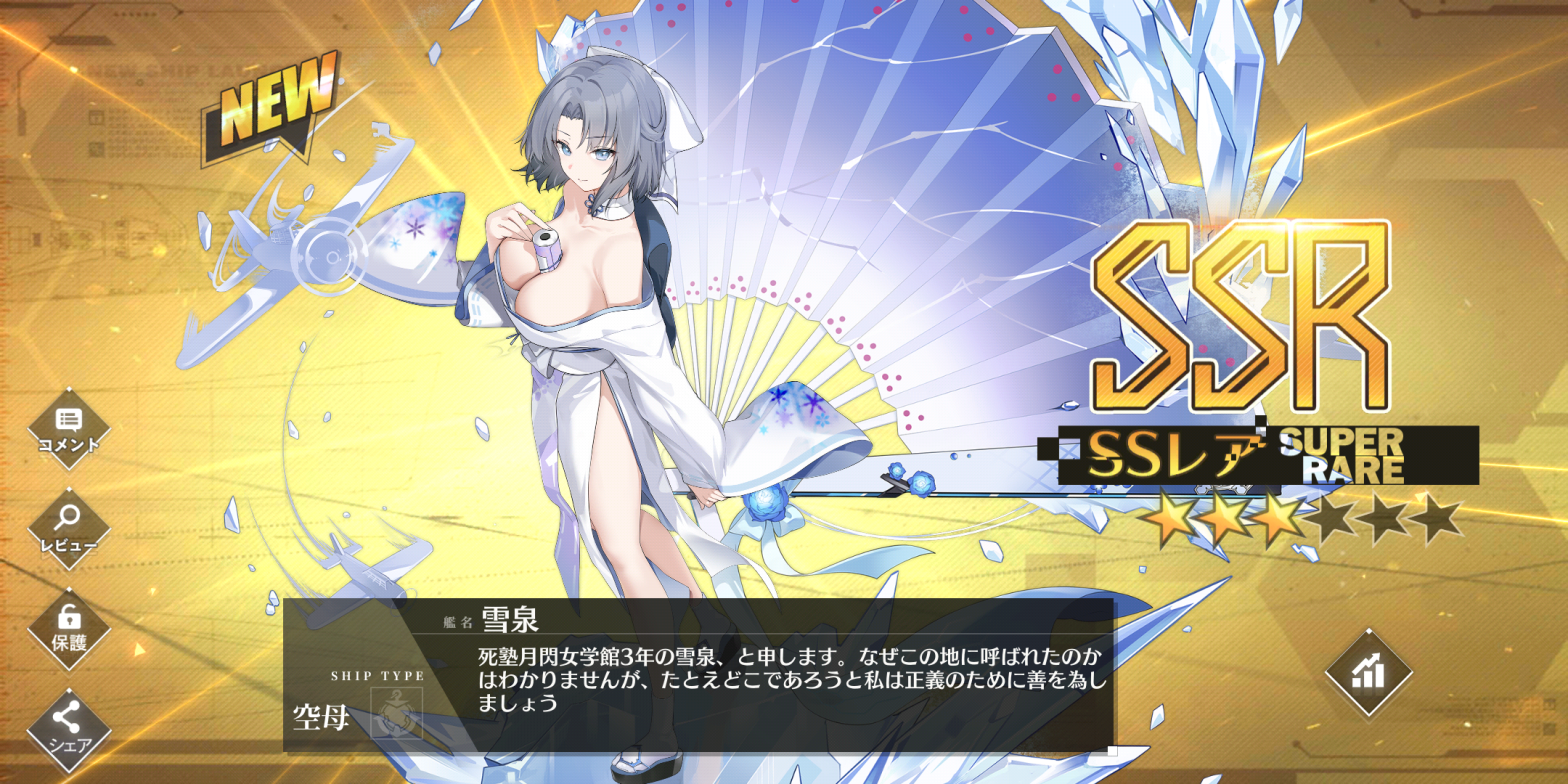 アップデート前に貯めておいた資金を費やし、50回建造(キューブ100個、資金75,000消費)した結果、入手した新キャラはSSRの雪泉を3人、SRの夕焼を1人。