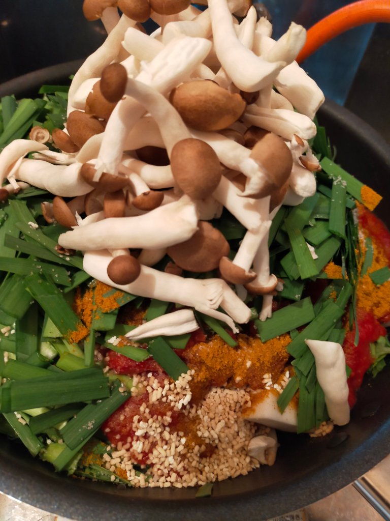 もやし、鶏むね肉、かぶ、春菊、ニラ、しめじ、トマト、コンソメ、カレー粉、岩塩だけでこの有様。