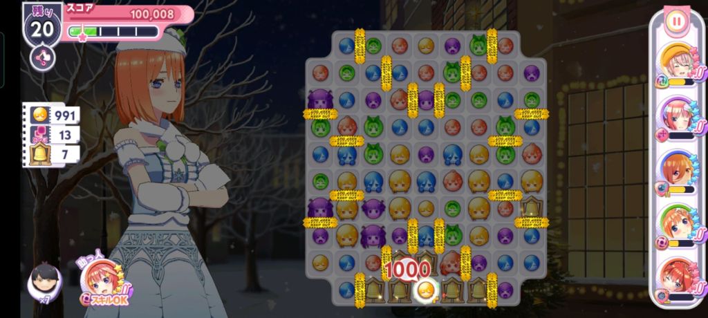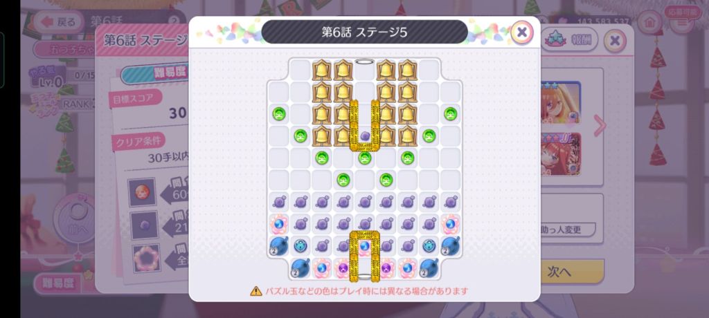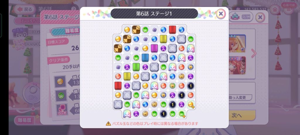 クリア条件は、20手以内、黄999個、13コンボ、ベル39個。