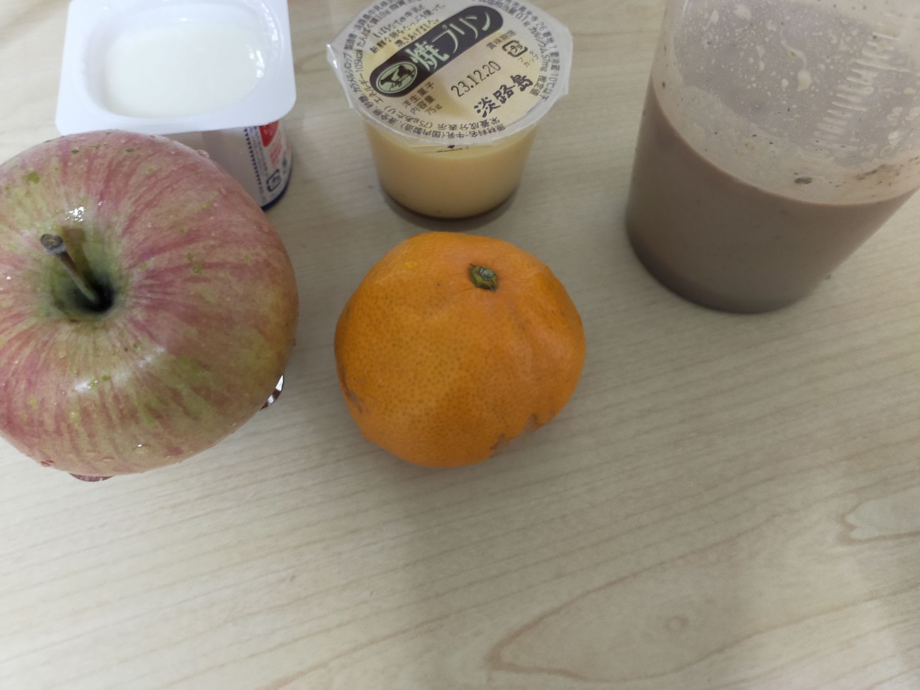 りんご、みかん、ヨーグルト、プリン、豆乳ミロきな粉プロテイン。