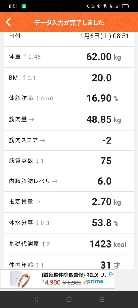 帰省後(3日前)に体組成計に乗ったが、極端な数値は無かったしな。